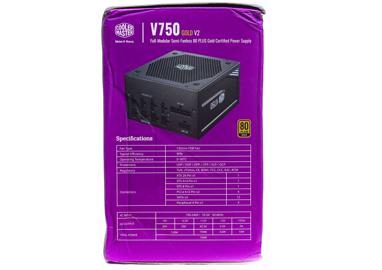 Блок питания поставляется в картонной коробке с цветной полиграфией, черный фон с фиолетовыми вставками – фирменное оформление производителя.