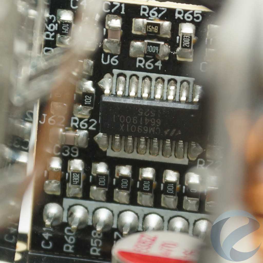 Микросхема CM6901X, управляющая преобразователем, вынесена на отдельную вертикальную плату, расположенную на краю основной.