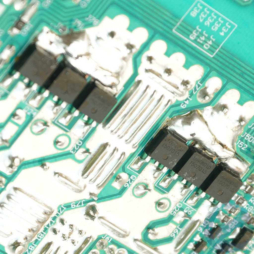 За трансформаторами начинается вторичная цепь, с трансформатора снимается напряжение +12 В. Шесть транзисторов синхронного преобразователя SG40N01D расположены с обратной стороны платы, через припой и дорожки платы они контактируют и охлаждаются двумя тонкими радиаторами на лицевой стороне платы.