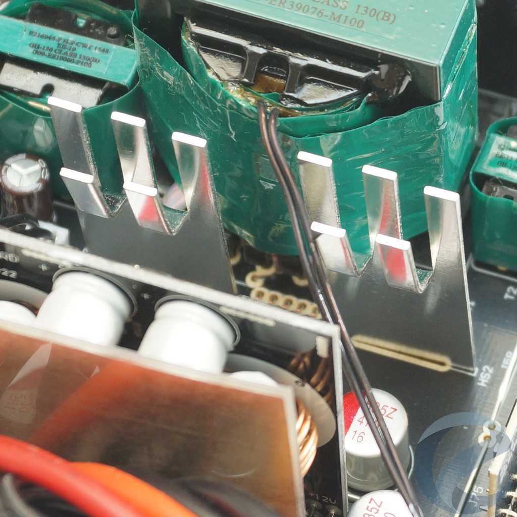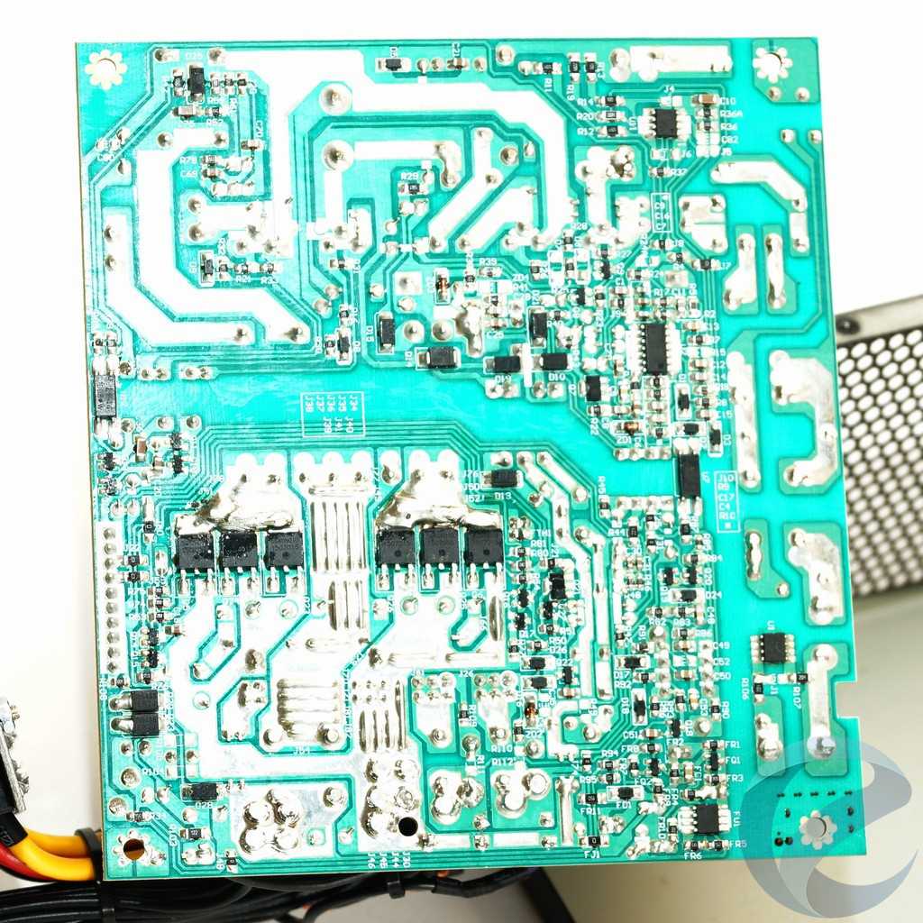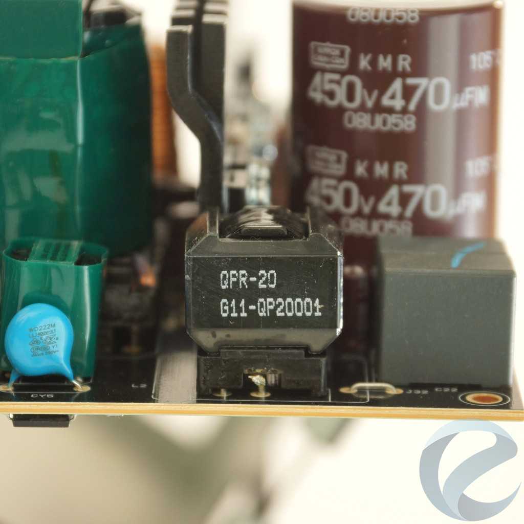 На краю платы – дроссель APFC в пластиковом кожухе, за ним сглаживающий конденсатор японского производства Nippon Chemi-Con емкостью 470 мкФ, рассчитанный на напряжение до 450 Ви температуру до 105 °C. В углу платы пара конденсаторов и пара дросселей колебательного контура первичного преобразователя -неотъемлемая часть схемы синхронного преобразователя. Такая схема хоть и сложнее обычной, но значительно эффективнее.