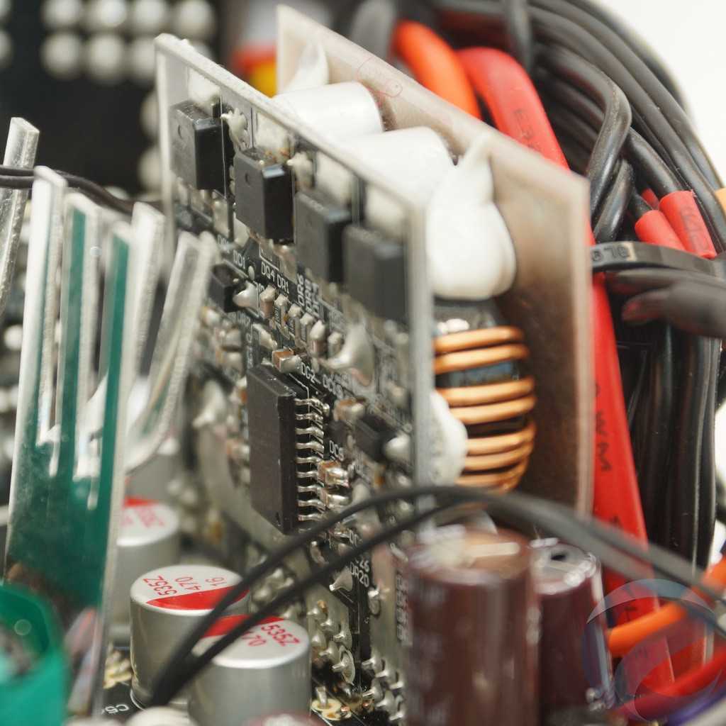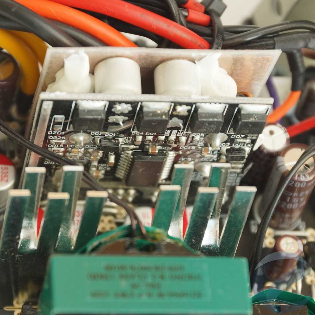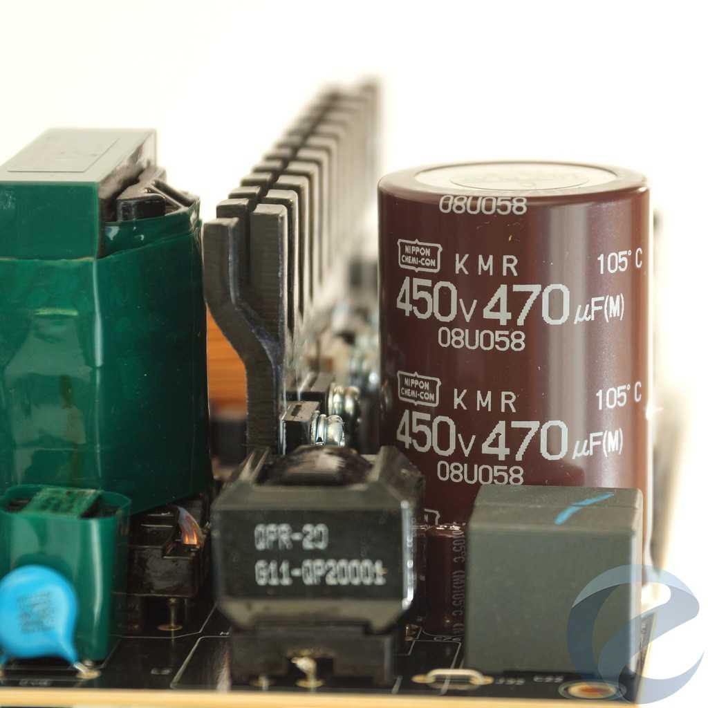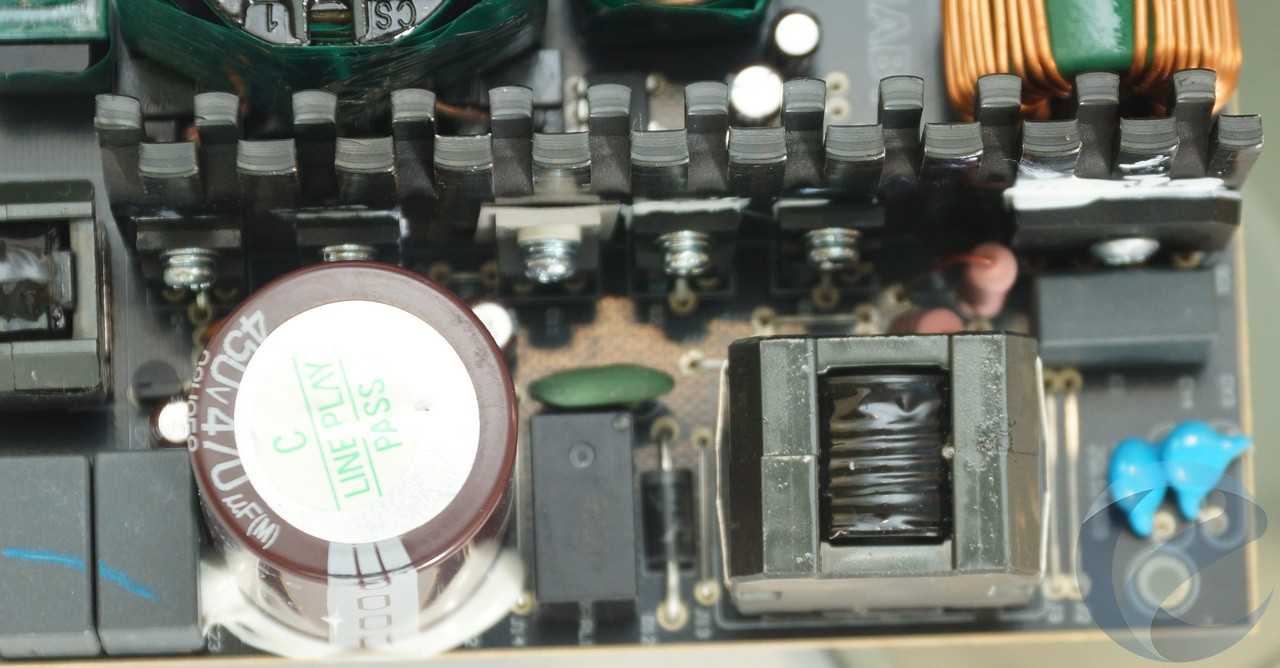 На краю платы – дроссель APFC в пластиковом кожухе, за ним сглаживающий конденсатор японского производства Nippon Chemi-Con емкостью 470 мкФ, рассчитанный на напряжение до 450 Ви температуру до 105 °C. В углу платы пара конденсаторов и пара дросселей колебательного контура первичного преобразователя -неотъемлемая часть схемы синхронного преобразователя. Такая схема хоть и сложнее обычной, но значительно эффективнее.