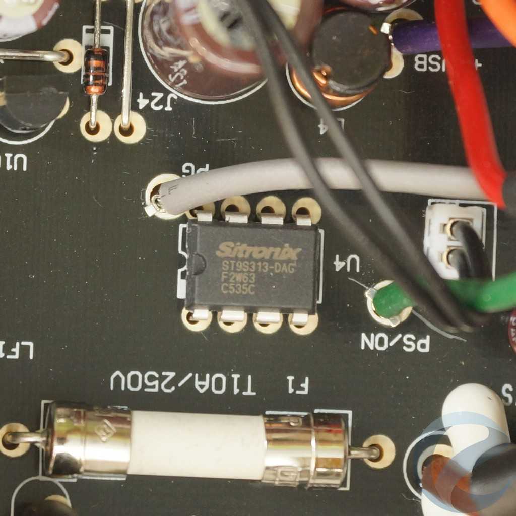 За защиту блока питания отвечает микросхема Sitronix ST9S313. Она обеспечивает все заявленные виды защиты. Пайка и монтаж на обратной стороне платы выполнены аккуратно и качественно.