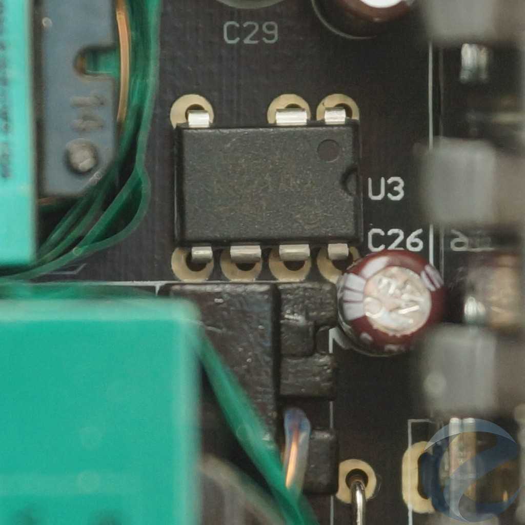 Далееза радиатором разместились два трансформатора: силовой и источника питания. Возле меньшего находиться и источник дежурного напряжения на популярной микросхеме TNY177PN.