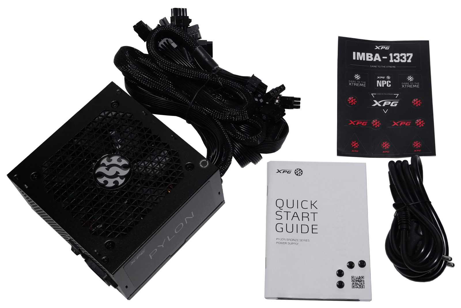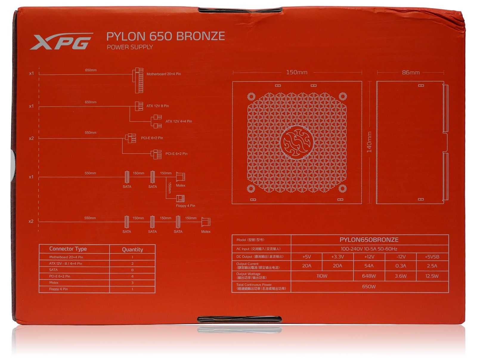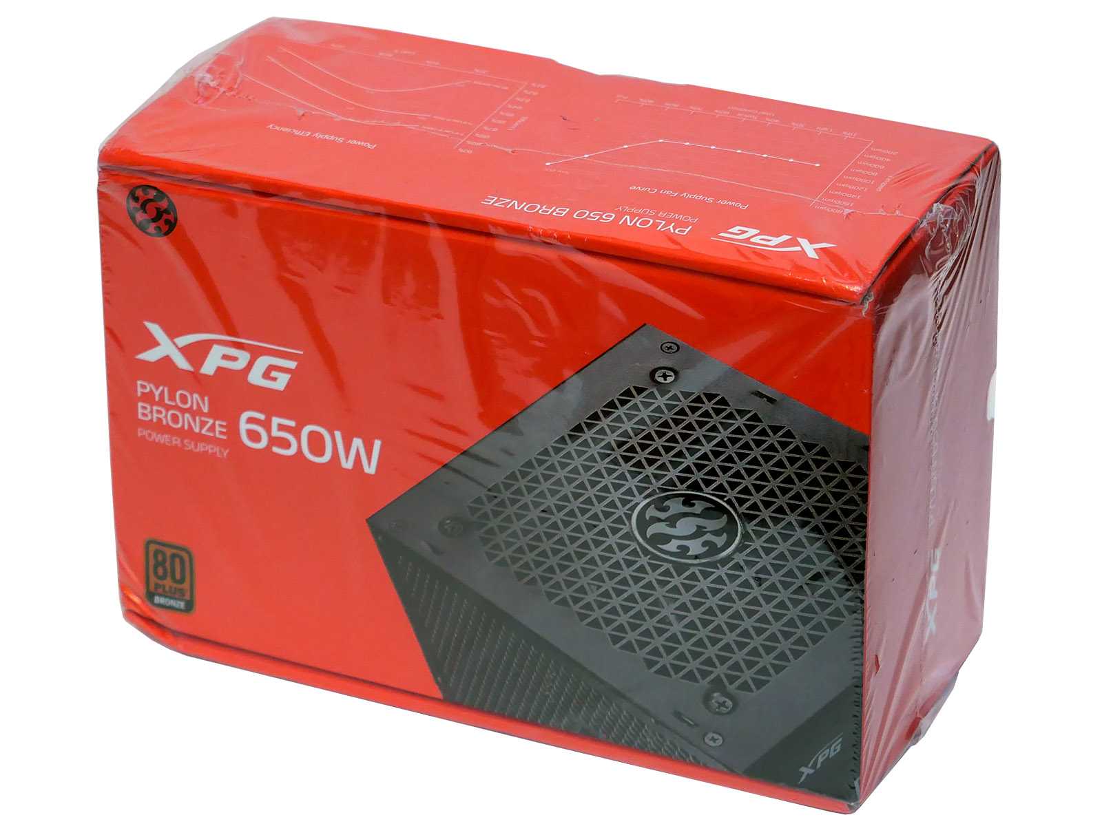 Блок питания XPG Pylon 650 BRONZE продаётся в броской ярко-красной коробке размером 27,8 x 19.2 x 11,3 см, запаянной в прозрачный полиэтилен. Плотность картона небольшая, поэтому транспортной компании при доставке удалось успешно «намять бока» упаковке.