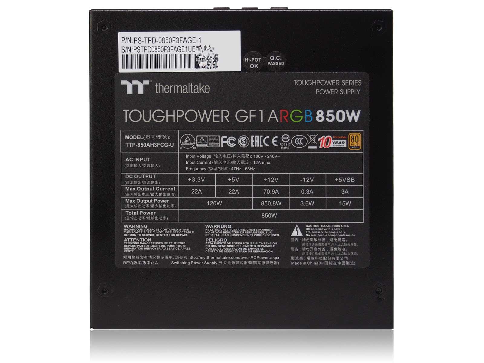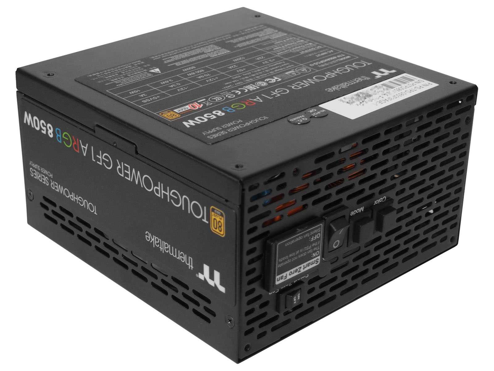 Корпус сделан качественно из металла толщиной 0,7 мм, окрашенного снаружи в чёрный цвет. В основе Thermaltake Toughpower GF1 ARGB 850W лежит OEM-платформа от CWT. Пометки на плате говорят, что это уже третья ревизия схемотехнического решения. Несмотря на отличие всего в одну букву в названии, GF1 заметно отличается от рассмотренной ранее серии PF1. Дело не ограничивается лишь избавлением от подсветки боковых стенок.