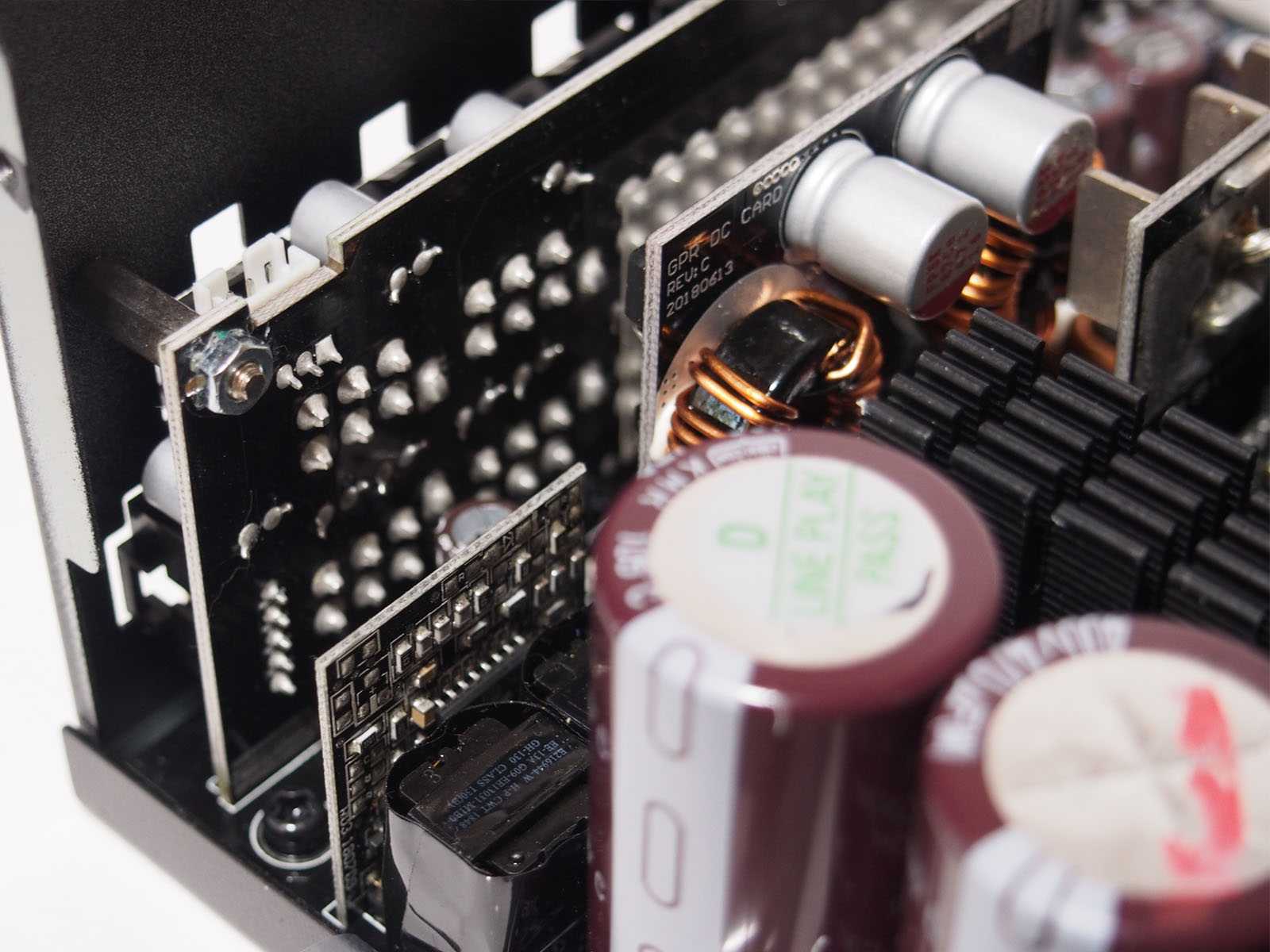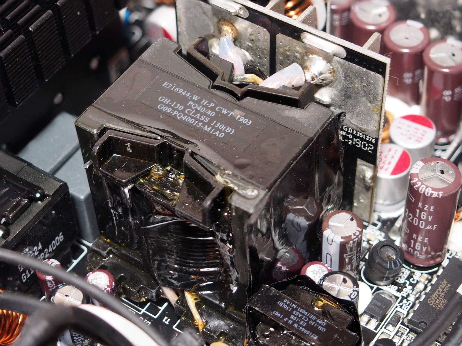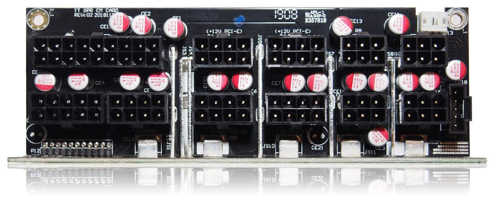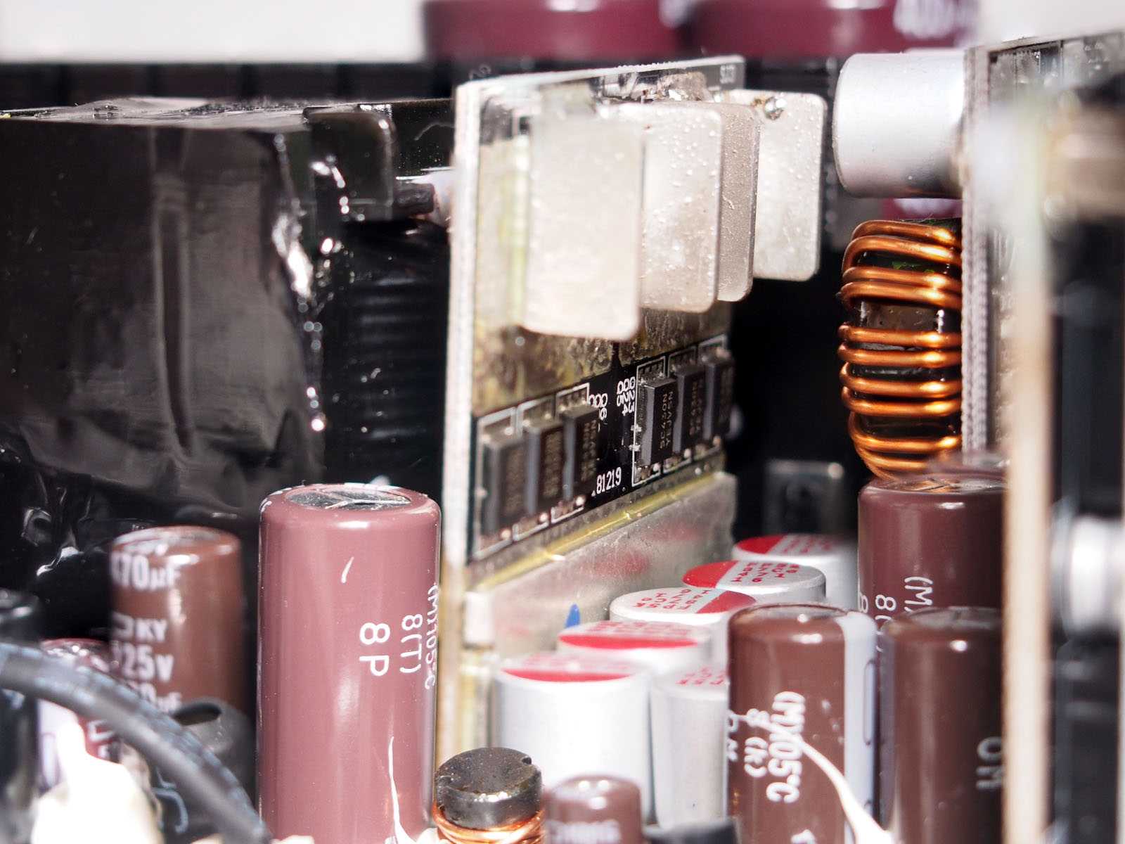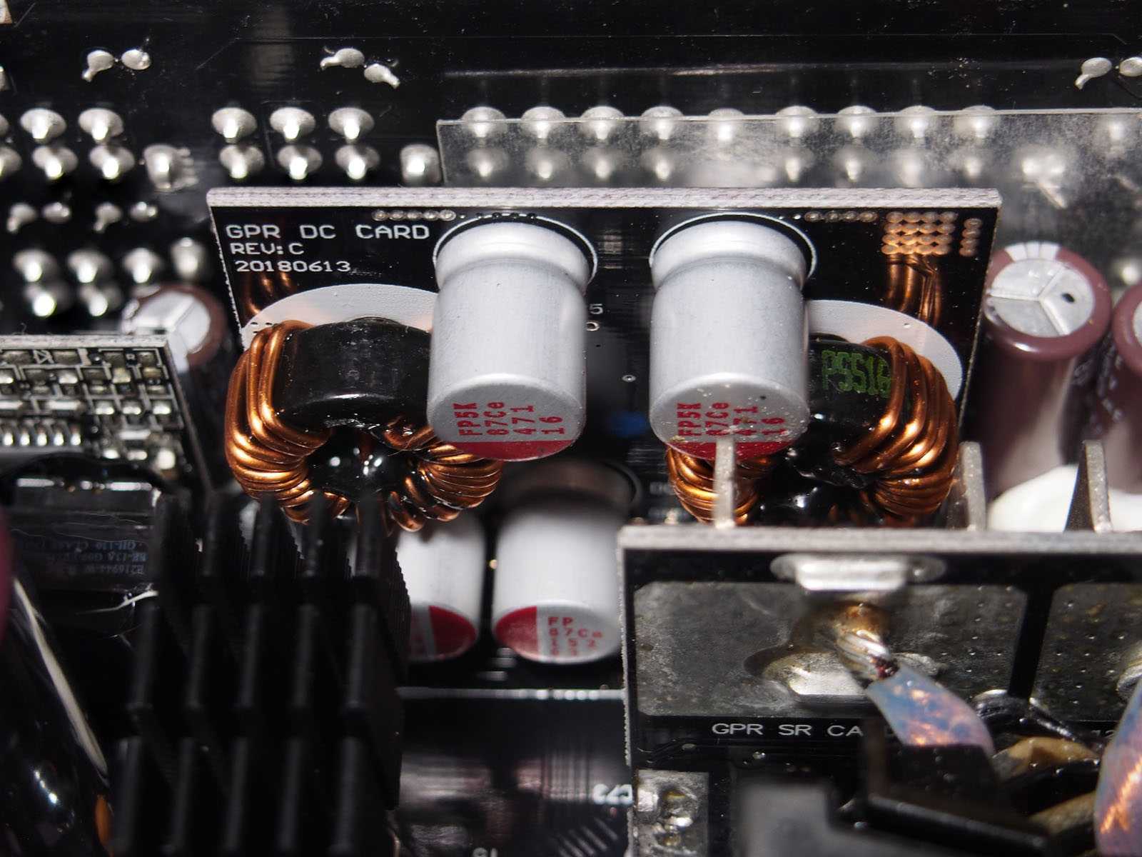 За формирование основной линии +12 В отвечает связка из крупного трансформатора и шести транзисторов SC430N на отдельной вертикальной плате. Контакты трансформатора впаяны напрямую в плату, чтобы минимизировать потери энергии.