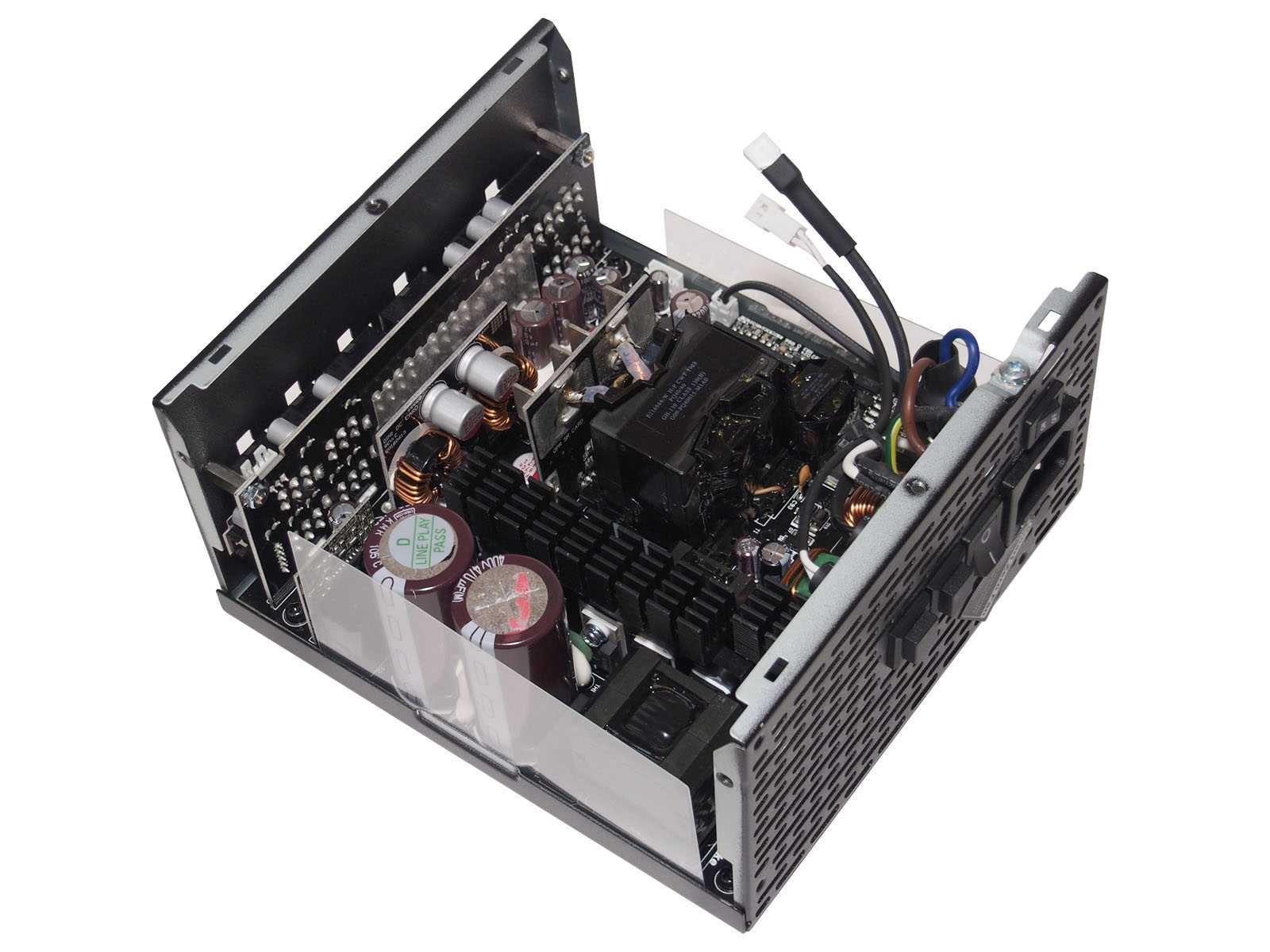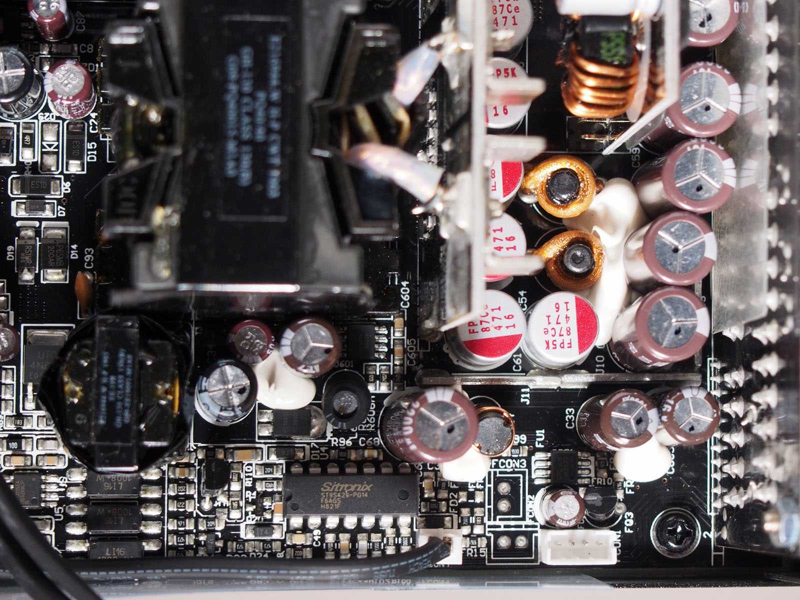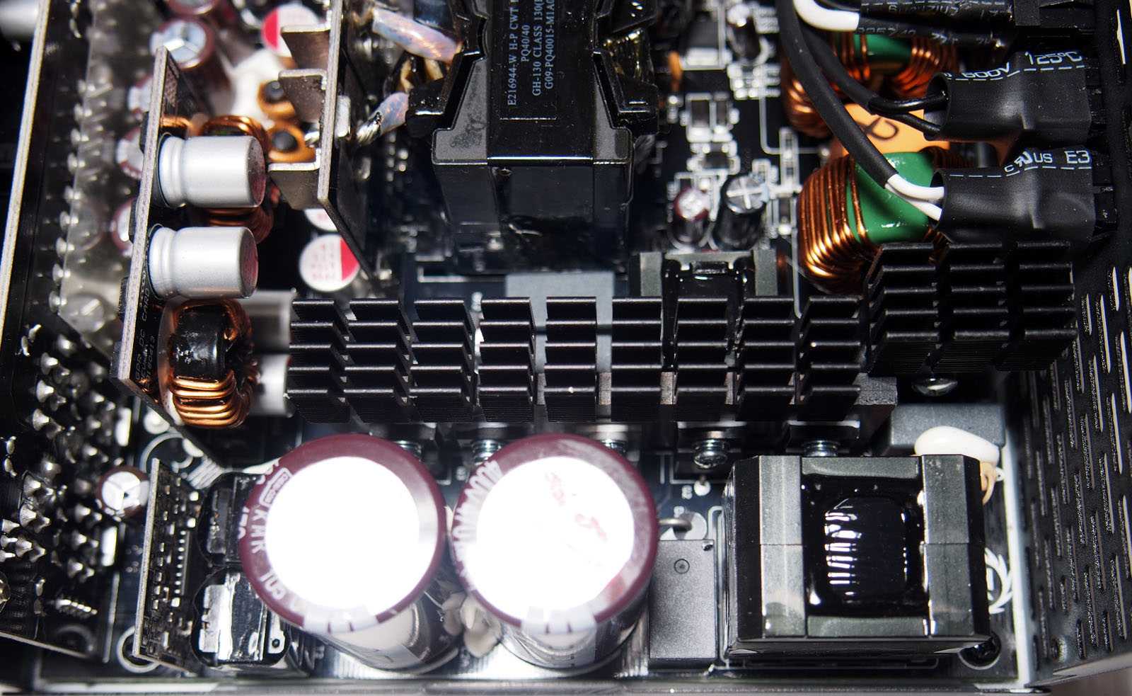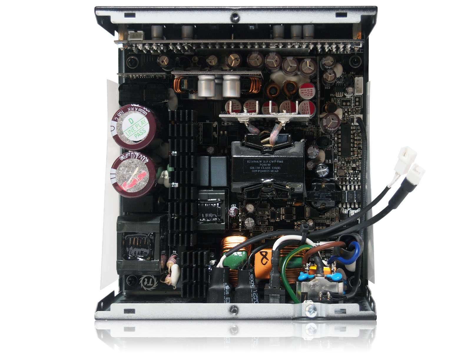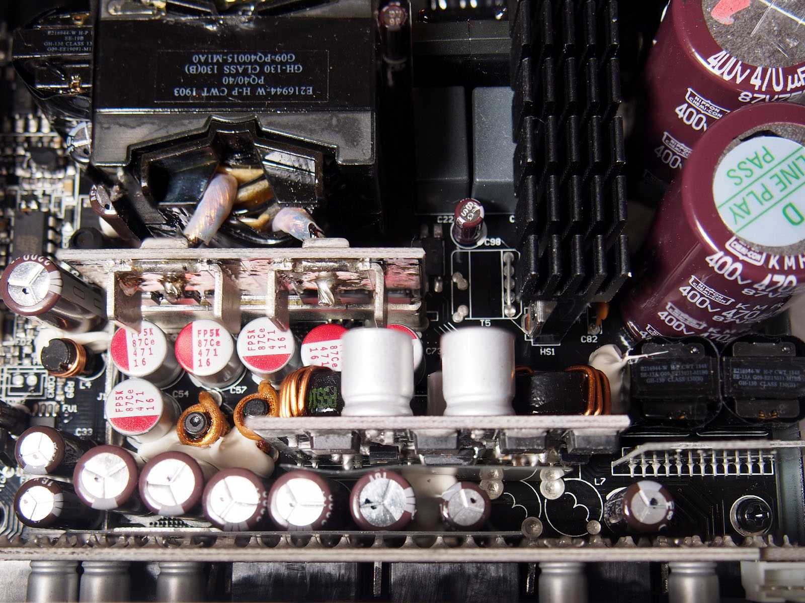 Элементы высоковольтного выпрямителя и корректора мощности размещены с общим охлаждением длинным радиатором. Плотная компоновка и близкое размещение крупного дросселя и конденсаторов также не позволяет их идентифицировать. Используется топология с основными коммутирующими полевыми транзисторами в полумостовой схеме включения и резонансный преобразователь LLC.