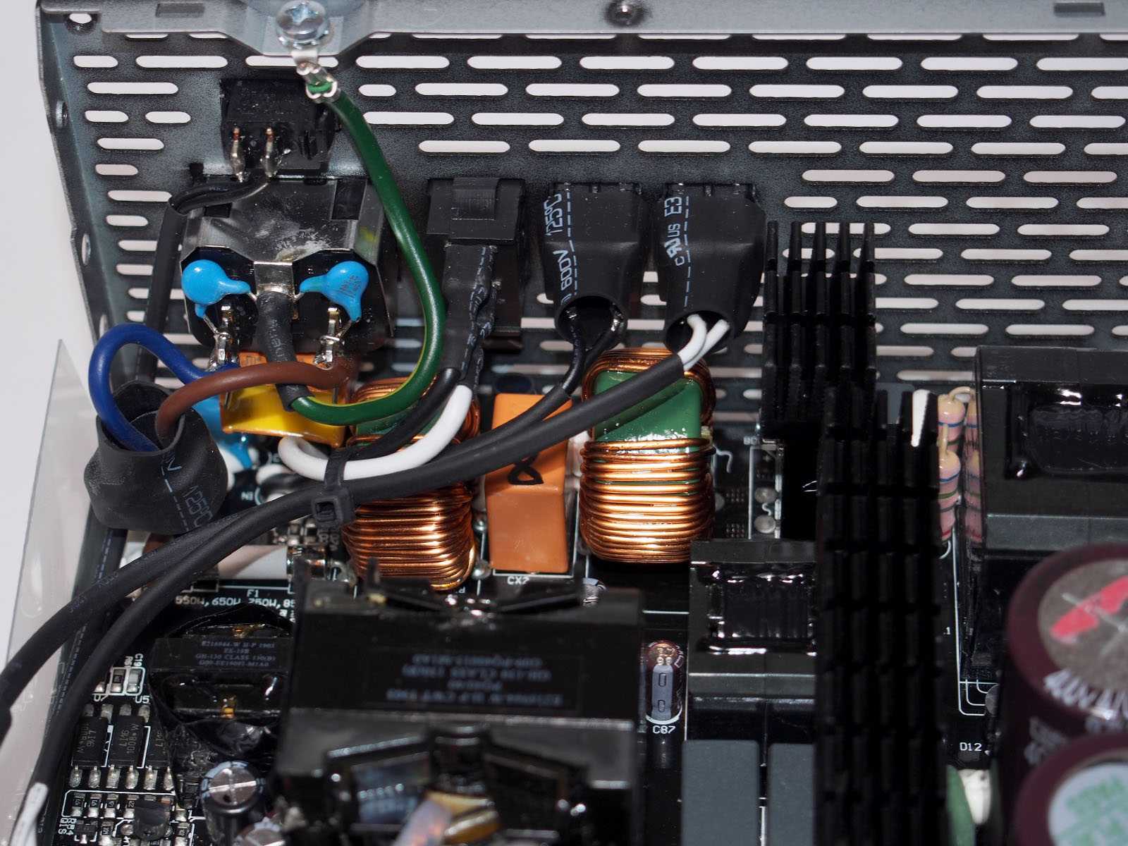 Как и подобает любому современному блоку питания на входе распаян фильтр электромагнитных помех, часть которого навесным монтажом закреплена на контактах разъема питания, вторая часть распаяна на основной плате. В цепи есть плавкий предохранитель. Блок рассчитан на работу в трёхпроводных цепях электропитания с заземляющим контактом. Соединение входного разъема с платой осуществлено впаянными проводами.