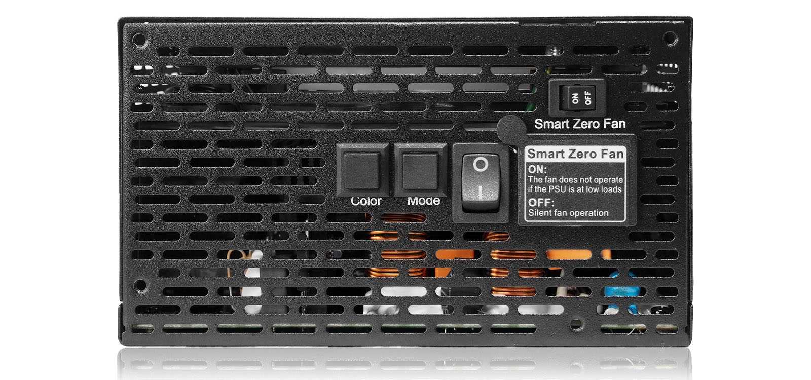 Обильная перфорация, заменяющая решетку вентиляции, теоретически снижает эффективность воздушного потока, но это должно не сильно волновать конечного пользователя. Учитывая установку малооборотистого вентилятора, конденсаторов с рабочей температурой до 105 градусов Цельсия и полупассивный режим работы, внутренние компоненты уже явно рассчитаны на работу в повышенном температурном режиме.