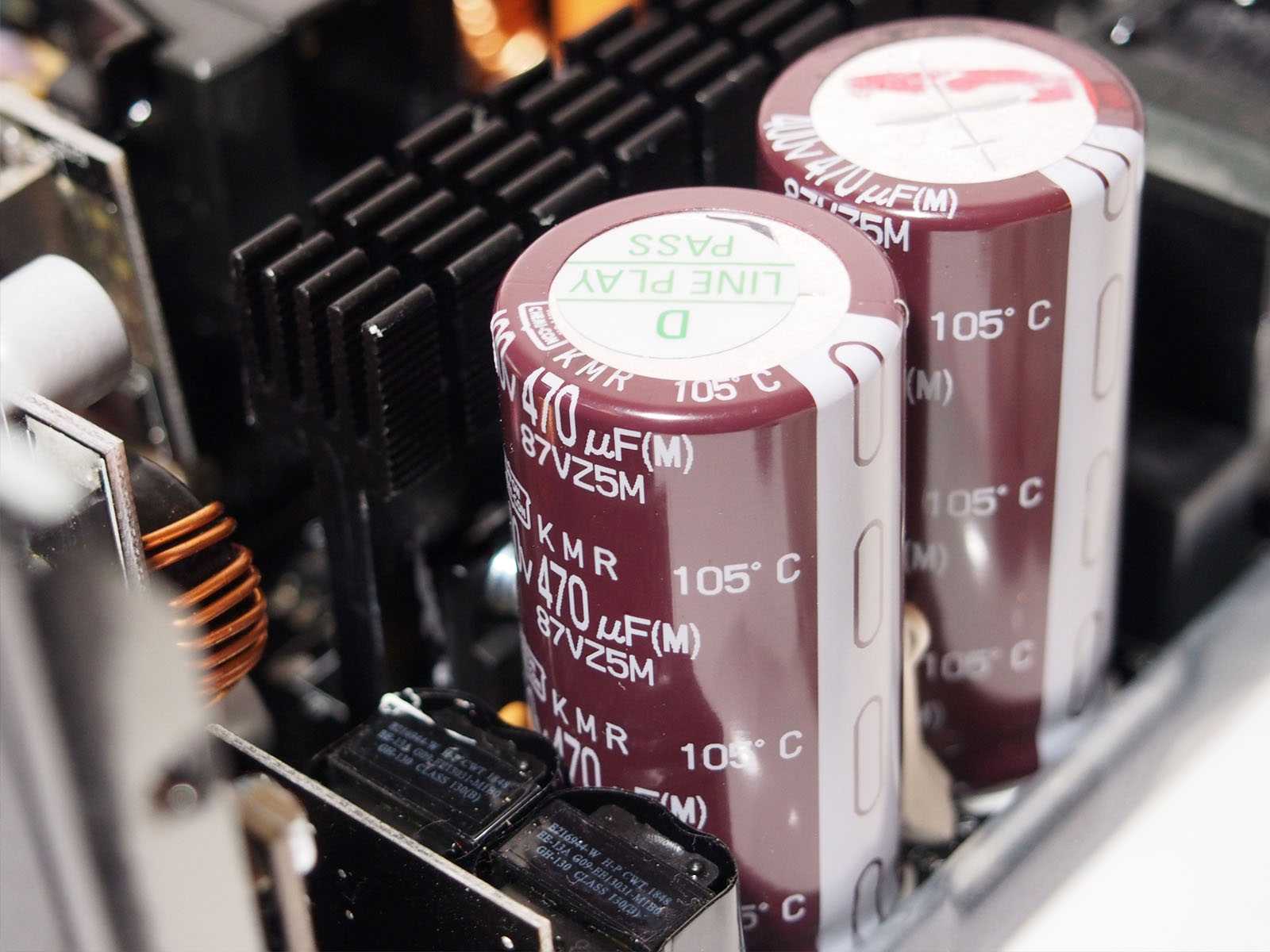 На высоковольтных конденсаторах не экономили: используются два параллельно установленных экземпляра (400 В, 470 uF, 105С) производства японской корпорации Nippon Chemi-Con с рабочей температурой до 105 °C. Суммарной ёмкости достаточно, чтобы обеспечить заявленные 16 мс удержания.