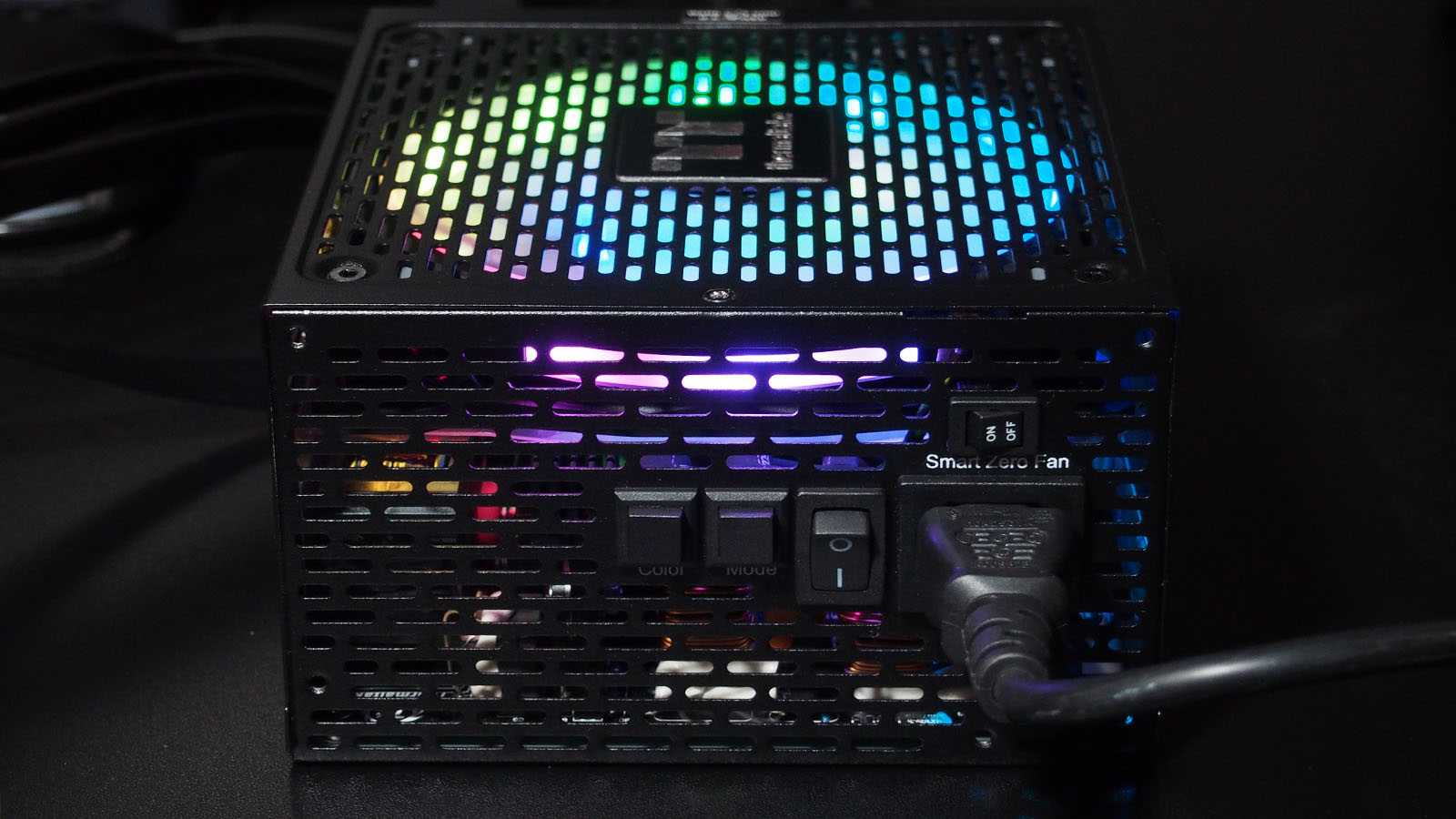 Заложено восемь интересных вариантов радужных переливаний, пульсаций и статических цветовых эффектов, переключаемых кнопкой MODE на задней стенке БП. Возможно и полное отключение подсветки. Кнопкой COLOR переключается цвет или направление эффекта. Установленный режим корректно запоминается при полном обесточивании блока питания.