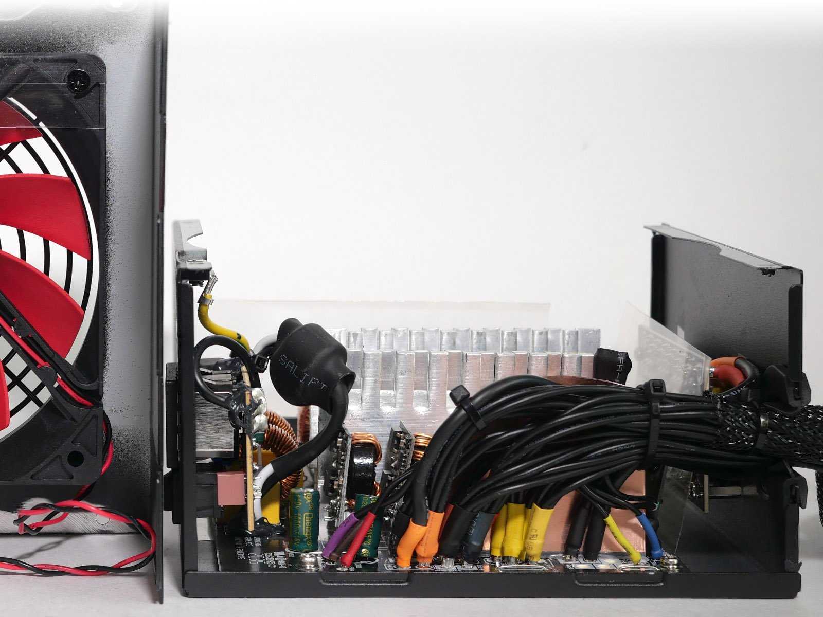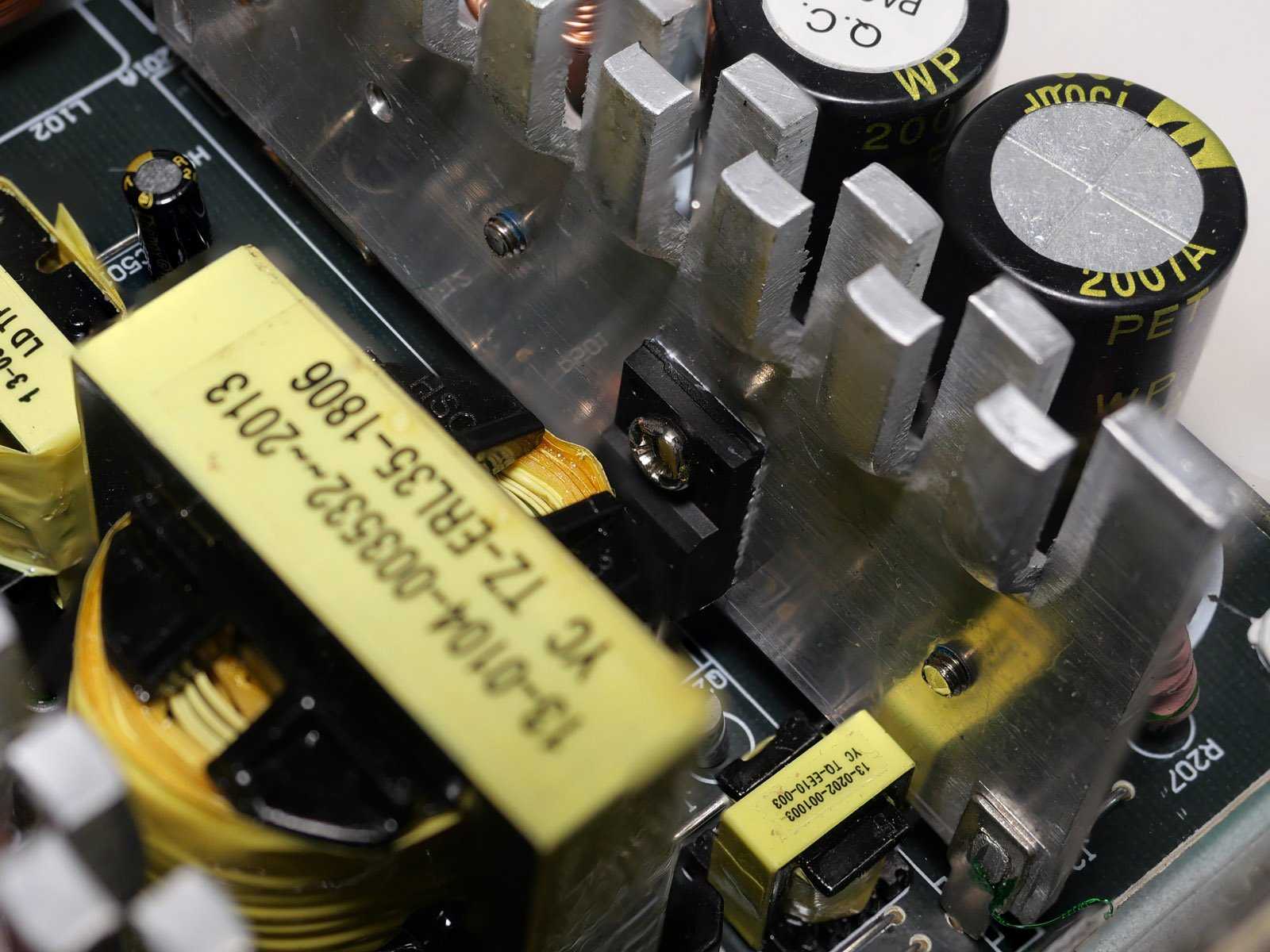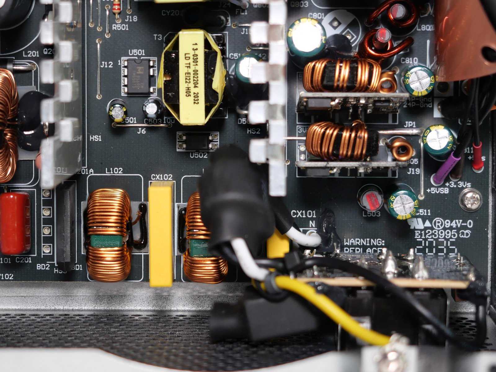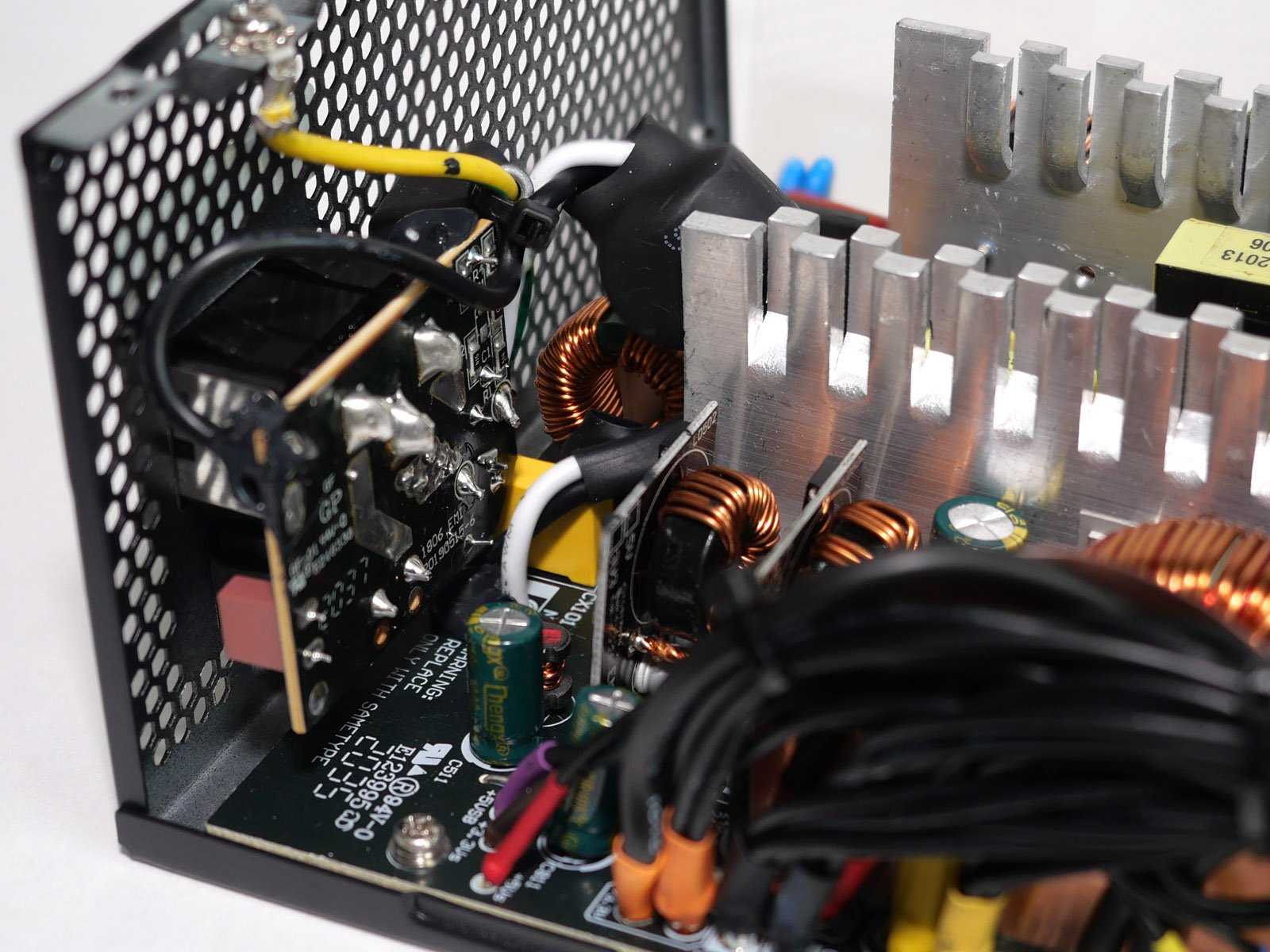 Внутреннее исполнение аккуратное. Относительно небольшая мощность в 650 Вт и размещение части элементов на компактных вертикальных платах позволили разместить силовые элементы без нагромождения, чтобы обеспечить нормальное охлаждение потоком воздуха от вентилятора.