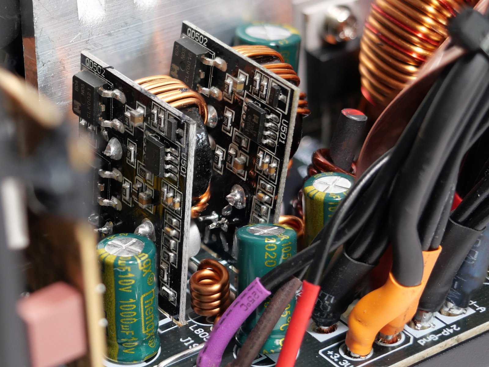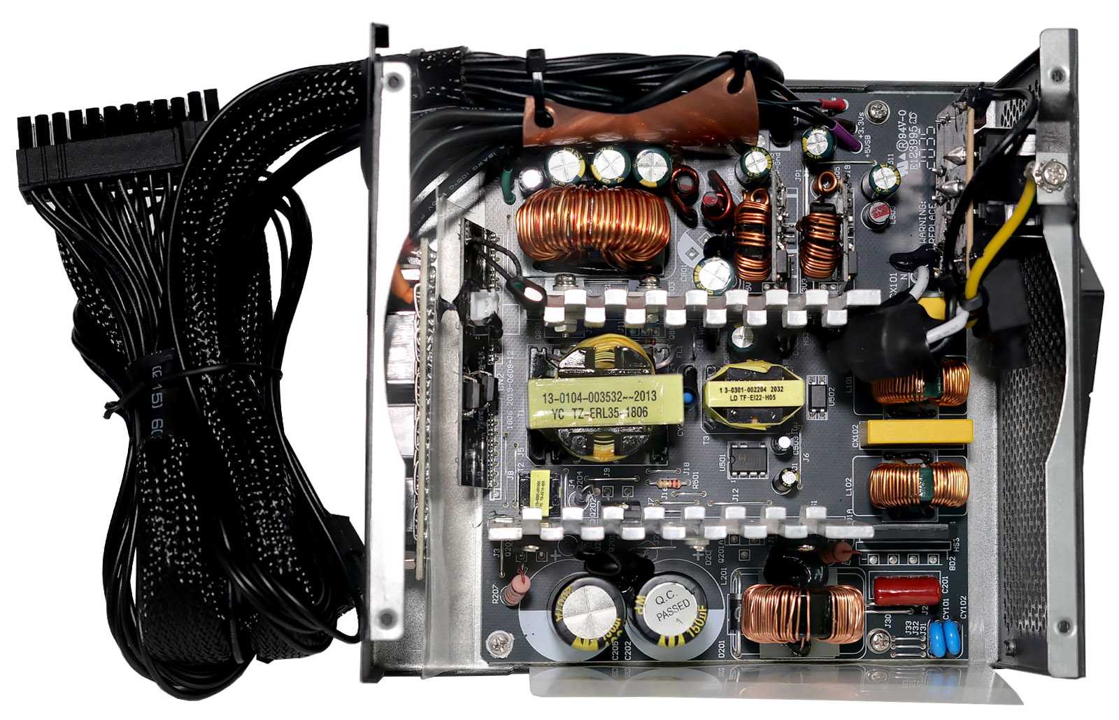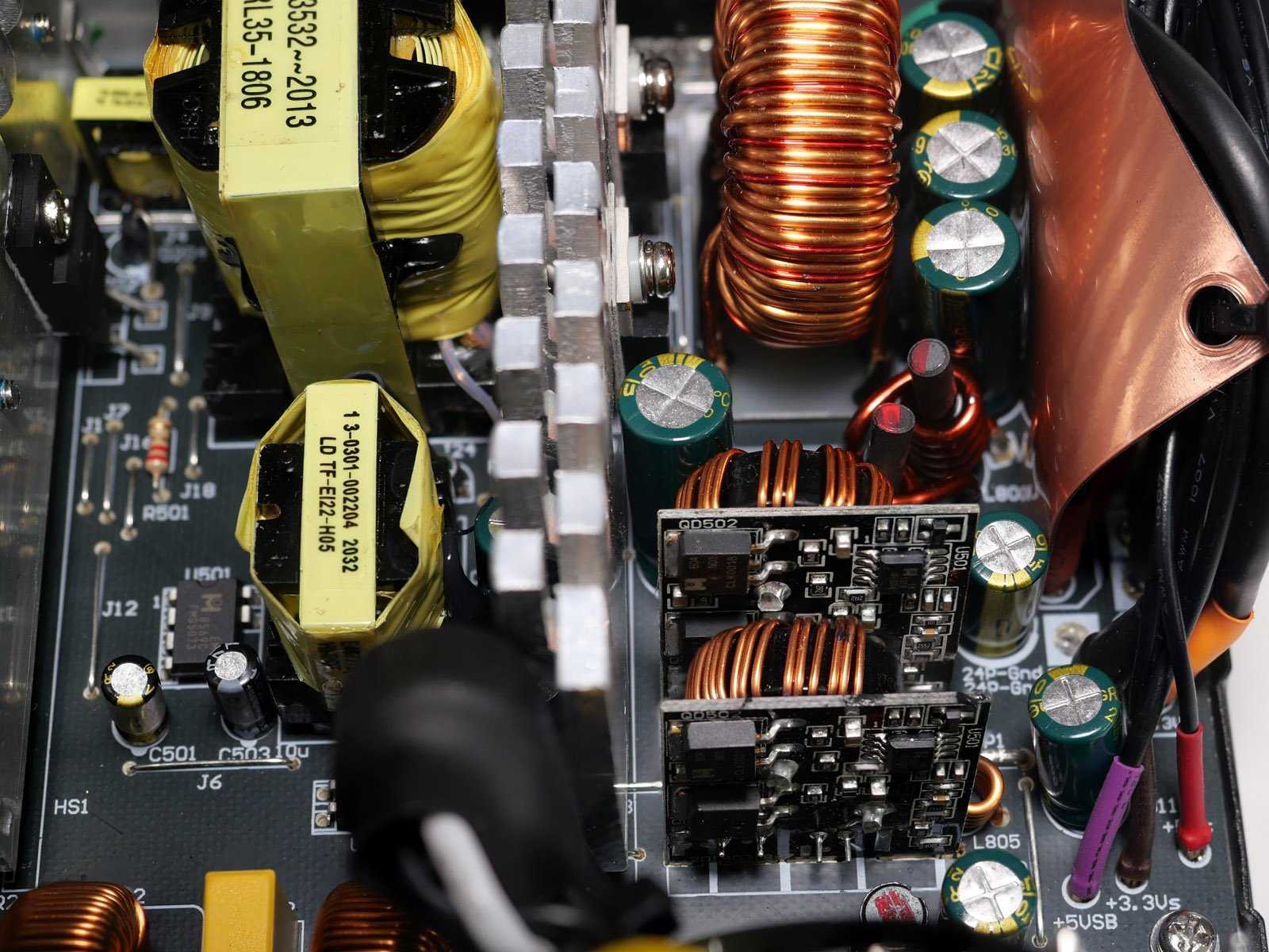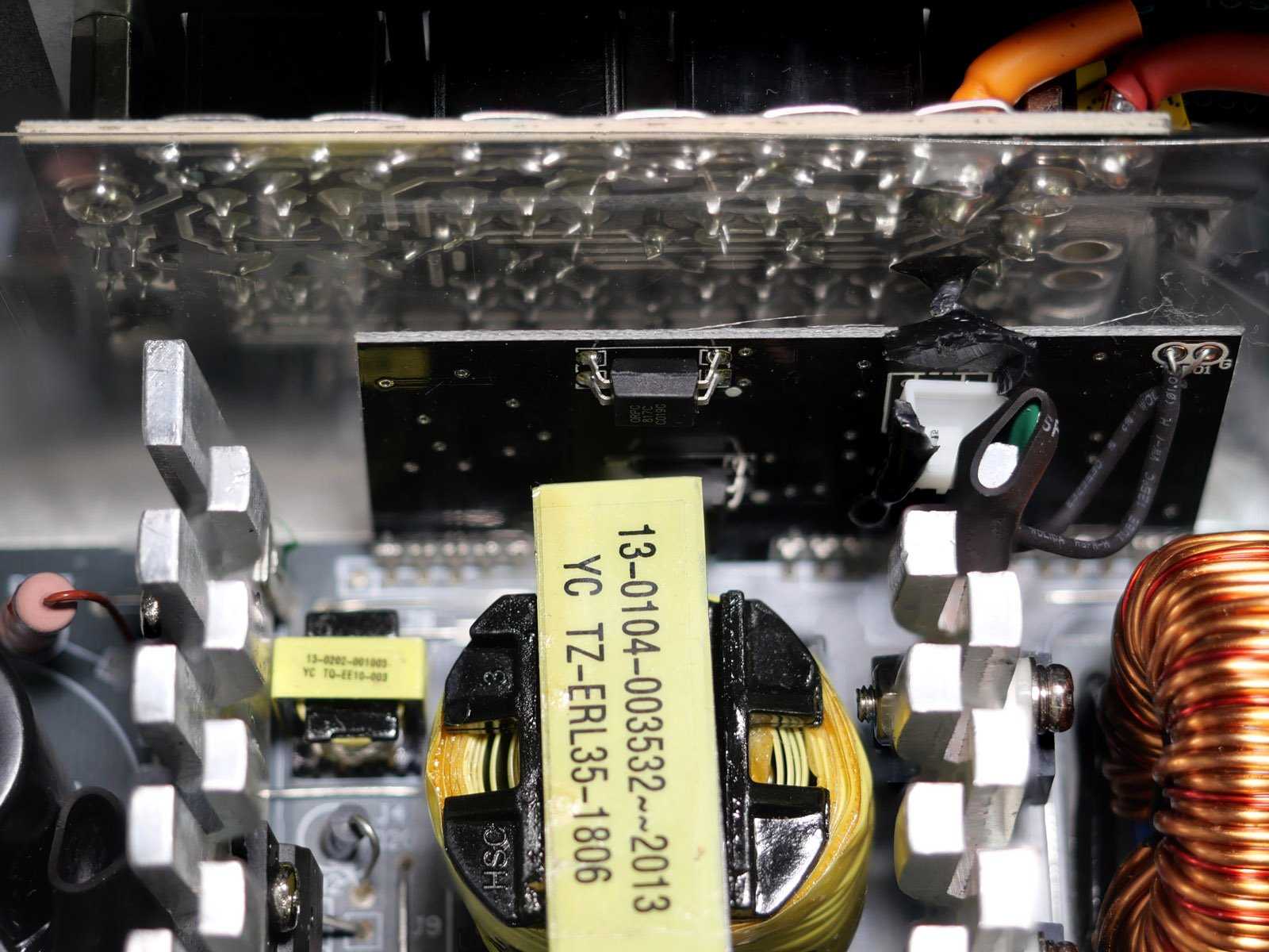 Внутреннее исполнение аккуратное. Относительно небольшая мощность в 650 Вт и размещение части элементов на компактных вертикальных платах позволили разместить силовые элементы без нагромождения, чтобы обеспечить нормальное охлаждение потоком воздуха от вентилятора.