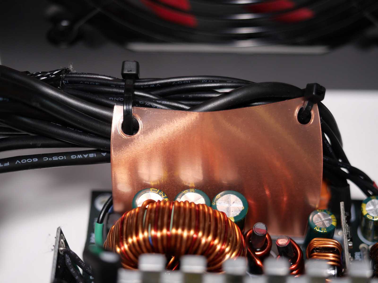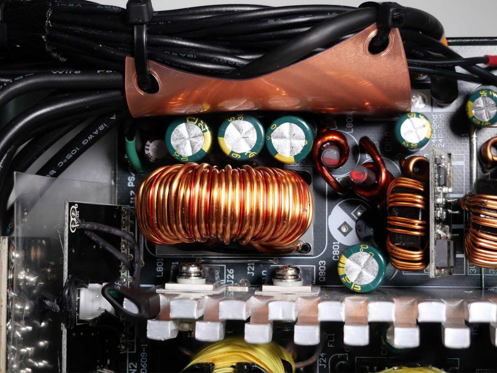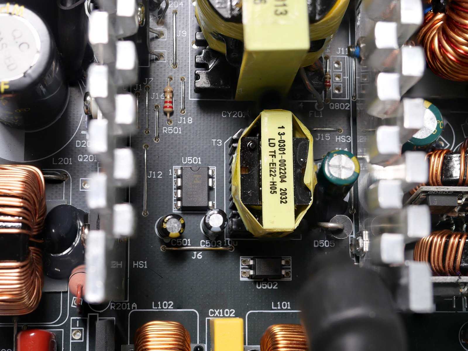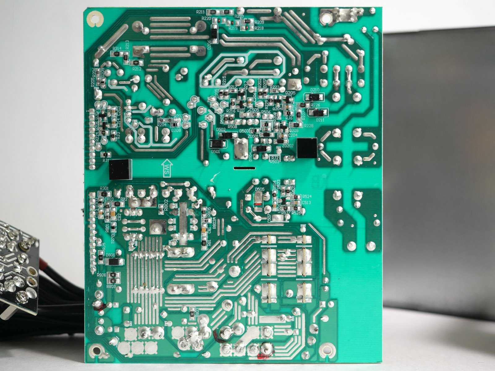 Внутреннее исполнение аккуратное. Относительно небольшая мощность в 650 Вт и размещение части элементов на компактных вертикальных платах позволили разместить силовые элементы без нагромождения, чтобы обеспечить нормальное охлаждение потоком воздуха от вентилятора.