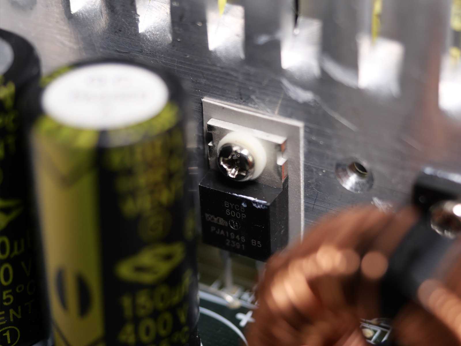 Корректор мощности собран по упрощённой схеме всего с одним ультрабыстрым выпрямительным диодом BYC8-600P (600 В, 8 А) и транзистором GPT18N50DG. Ещё пара таких же полевых транзисторов GPT18N50DG используется в качестве ключей главного преобразователя.