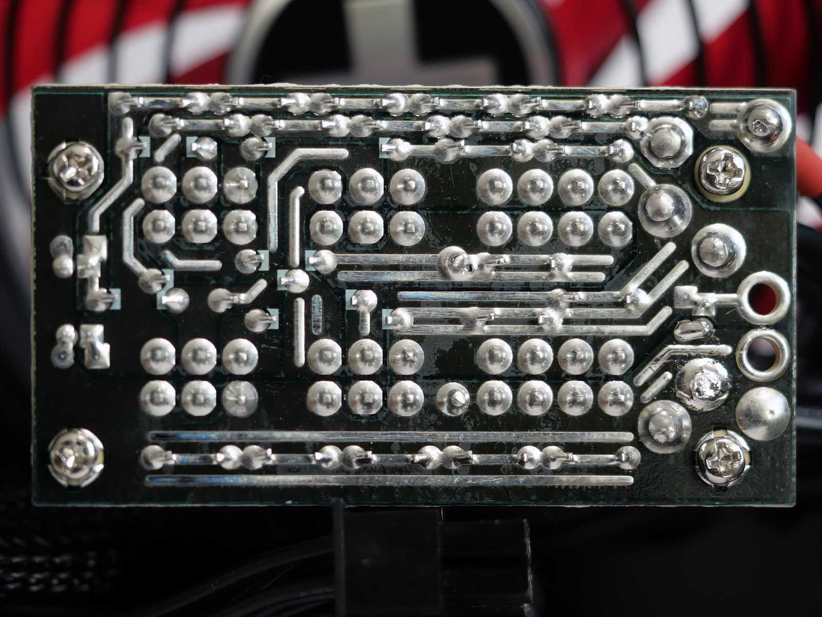 Модульные разъёмы также вынесены на отдельную плату. На ней установлены три дополнительных фильтрующих электролитических конденсатора.