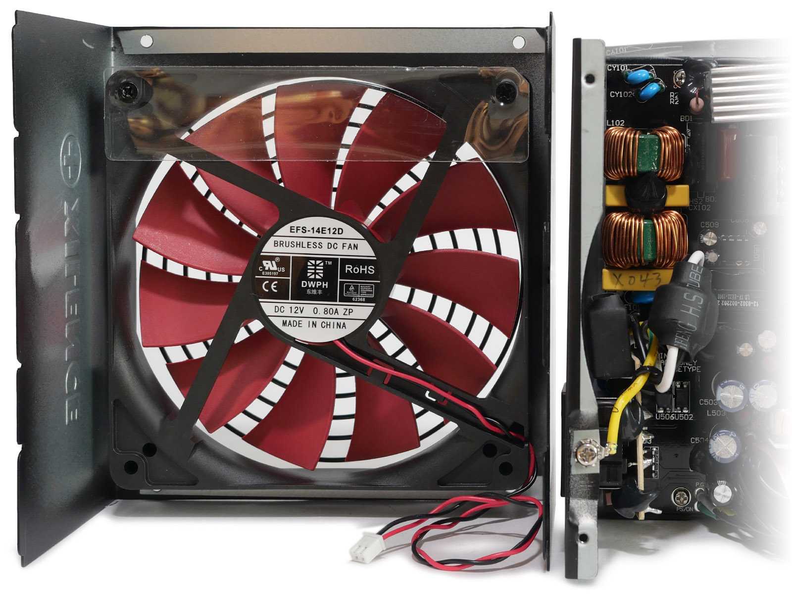 Для активного охлаждения компонентов блока питания установлен 135-мм вентилятор DWPHEFS-14E12D с одиннадцатилопастной крыльчаткой из характерного для Xilence красного пластика. Детальной информации по его скоростным характеристикам нет. Подключение к основной плате внутри блока двухпроводное через двухконтактный разъём.