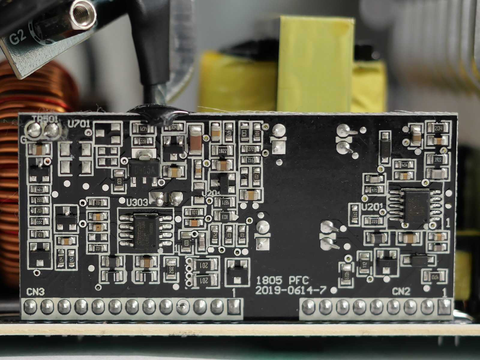 В глаза бросается заметная экономия на высоковольтном сглаживающем конденсаторе. Установлена достаточно дешевая пара ёмкостью по 150 uF производства 12KUANG JIN. Понятно почему производитель ограничился гарантией 2 года на блок питания в целом.