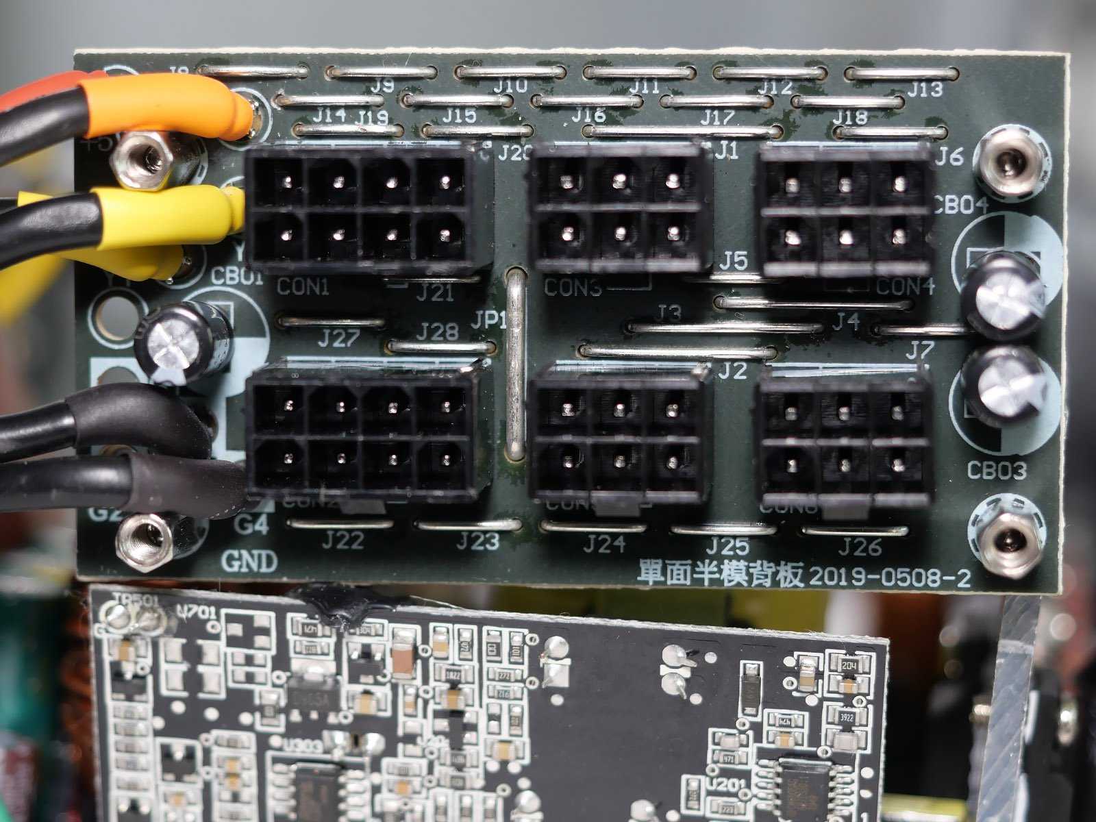 Модульные разъёмы для кабелей питания PCI-E и внутренней периферии размещены на одной грани с несъёмным пучком проводов к материнской плате. Выводы сделаны аккуратно и подписаны краской золотистого цвета. Форма коннекторов отличается по количеству контактов, что исключает неправильное подключение.
