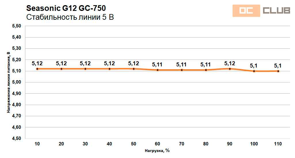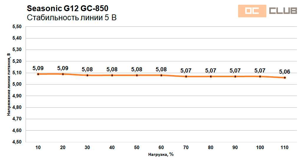 - по линии +5 В — от 5,04 В до 5,14 (отклонение менее 2,8% в положительную сторону с ростом нагрузки вызвано вероятнее всего слабой нагрузкой на линию +5 В в ходе тестирования);