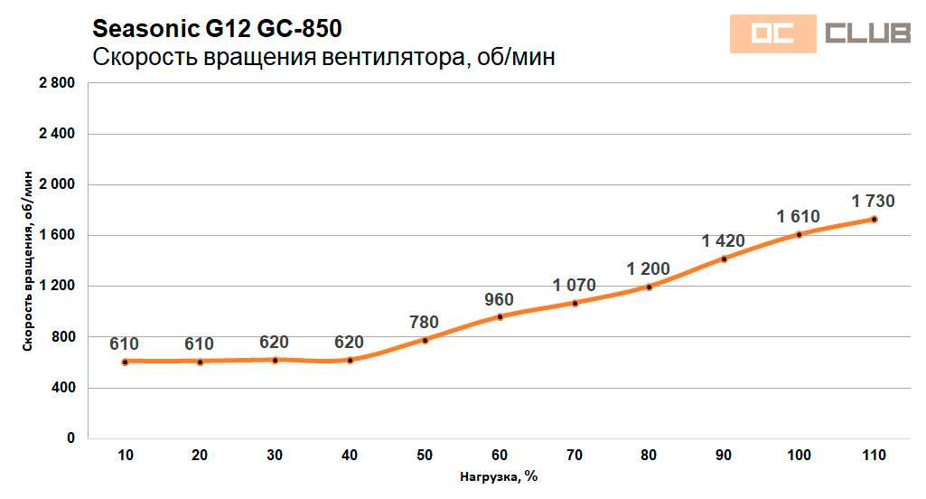 Как правило, блок питания является одной из самых шумных комплектующих в ПК. К сожалению, измерить уровень шума в децибелах не представляется возможным. Рёв вентиляторов нагрузочного стенда умножает все эти попытки на ноль, как вблизи, так и на более удалённых расстояниях. Поэтому на графиках приведены показатели скорости вращения вентилятора и при наличии график от производителя с измерениями в децибелах. 120-140 мм вентилятор становится различим (но очень тихо) примерно с 1000 об/мин, 1500 об/мин – отчётливо слышен (в условиях открытого стенда).