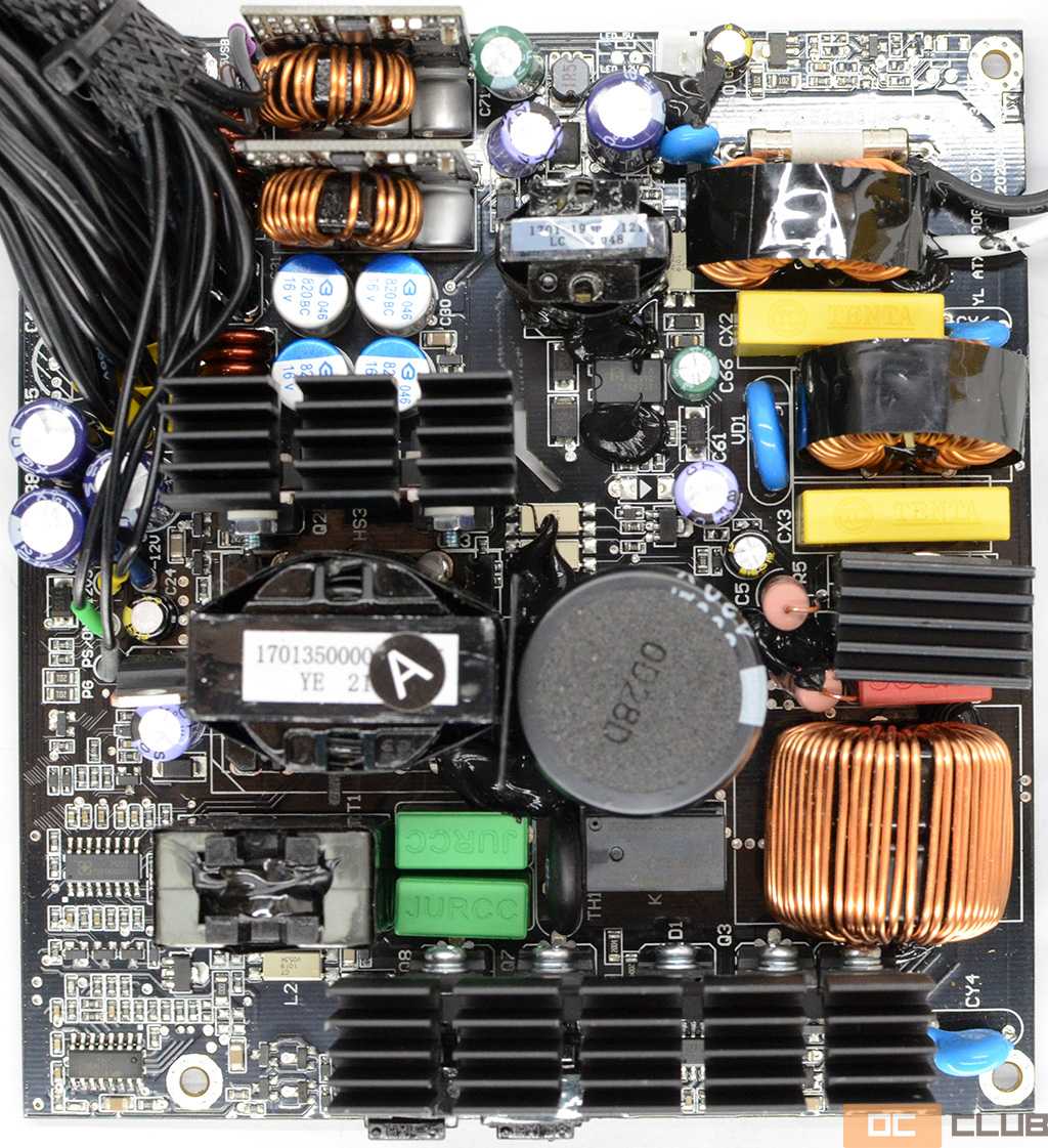 На входной фильтр не поскупились, распаяв полный набор из 3х X-конденсаторов, 4х типа Y, 3х дросселей, есть варистор, плавкий предохранитель. Особенно радостно видеть варистор, имеющийся далеко не у каждого блока среднебюджетного класса.
