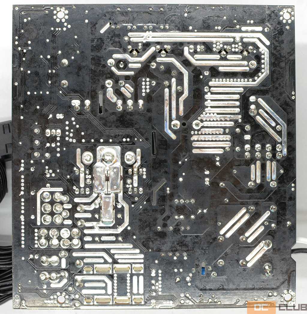 Компоновка довольно плотная и сразу же хочется отметить, что это не «блок на перемычках». Перемычек вообще нет, как и пустых контактных площадок. Во-вторых, после половины входящего фильтра все напряжения передаются исключительно через толстые токопроводящие слои текстолита, без каких-либо гибких проводников. Казалось бы, очевидная вещь, но недавно в обзоре CoolerMaster MWE Bronze V2 были найдены довольно опасные «сопли» к трансформатору.