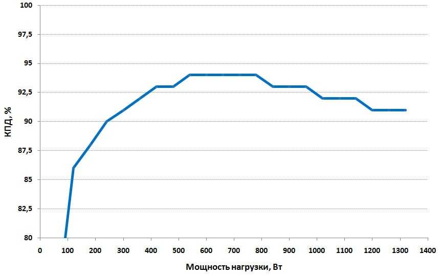 У Prime 1300 (SSR-1300PD) сертификат 80 PLUS Platinum, а значит КПД не должен падать ниже 90 процентов в диапазоне нагрузок от 20% до 100% мощности, а на половинной нагрузке доходить до 94%. В целом испытуемый блок в оговоренные рамки попадает, но отмечу сильно сниженную эффективность при нагрузках мощностью менее 250 ватт. Идеальный вариант – нагрузка от 300 до 1000 ватт мощностью.
