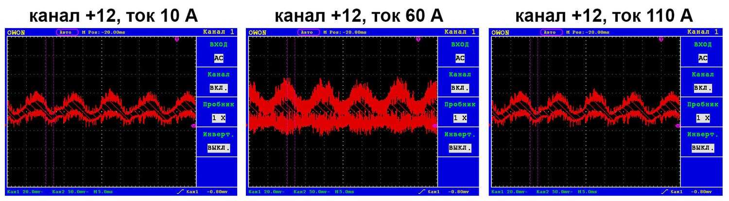 Пульсации также в пределах допуска, около 60 мВ при максимальной нагрузке