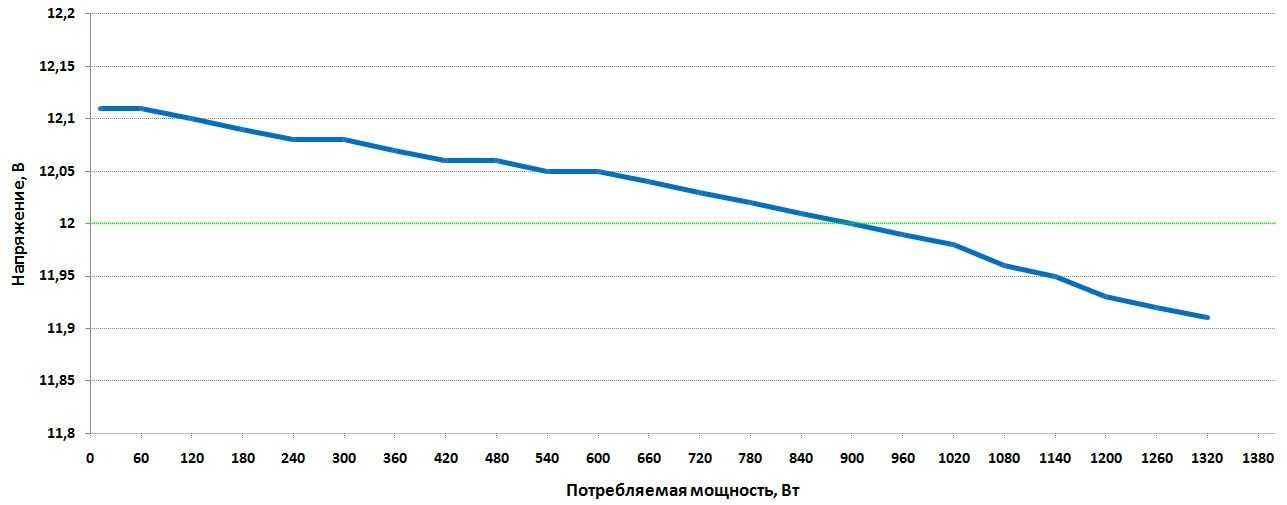 Стабильность напряжений на канале +12 хорошая – в плюс около одного процента, столько же в минус. Минимальное значение – 11,91 В, максимальное – 12,11 В