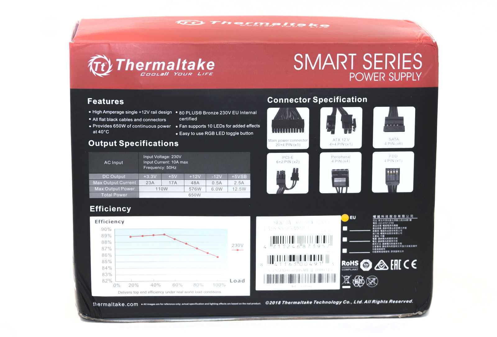 Блок питания поставляется в картонной коробке. Черный фон, сверху красная полоса – отличительная черта упаковки БП с «бронзовым» сертификатом. На лицевой стороне имеется изображение внешнего вида блока питания с включенной подсветкой. Слева перечислены основные особенности модели.