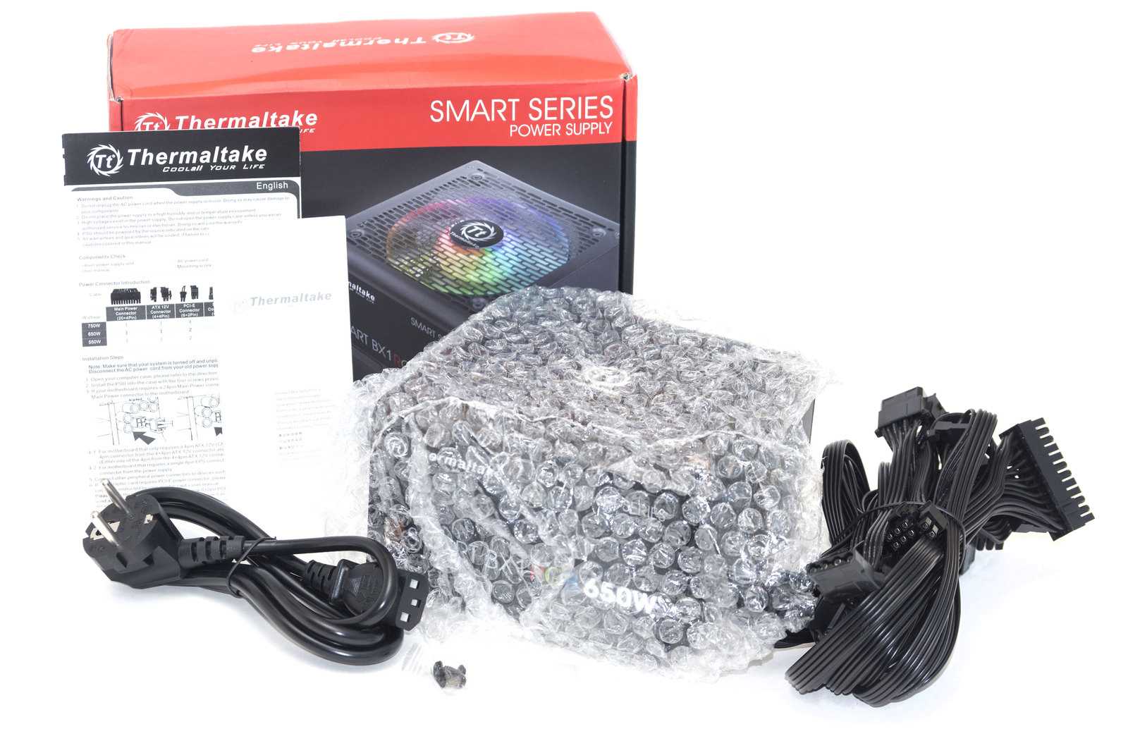 В комплектацию производитель добавил крепежные винты для монтажа и кабельные стяжки. Модель прекрасно переносит скачки напряжения в сети. Его номинальная мощность составляет 650 Ватт. Он идеально подходит для сборки офисных, домашних игровых ПК. В модели реализована полупассивная система охлаждения, что защищает от посторонних звуков при работе.