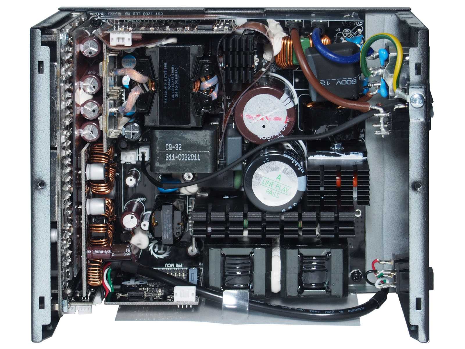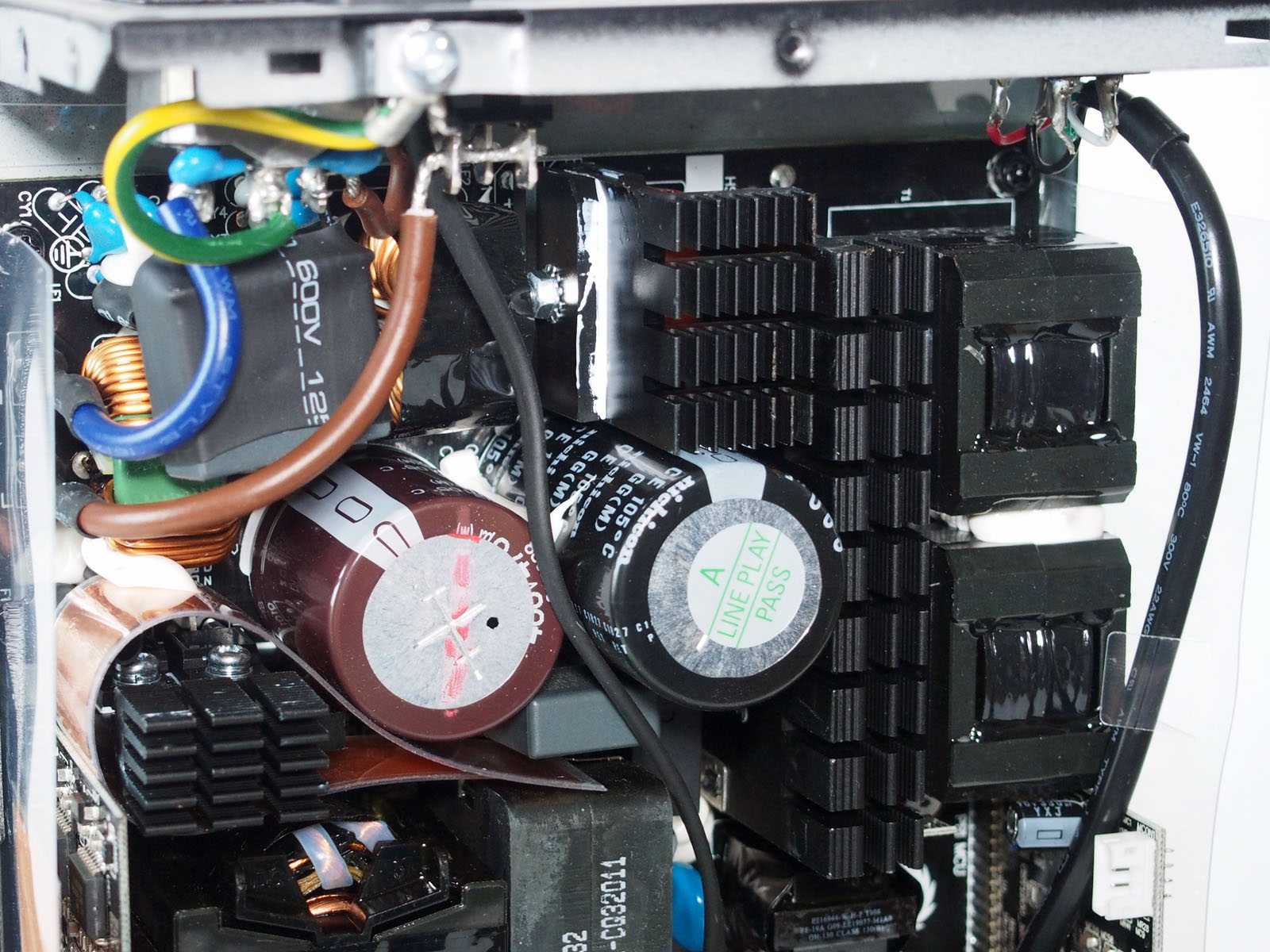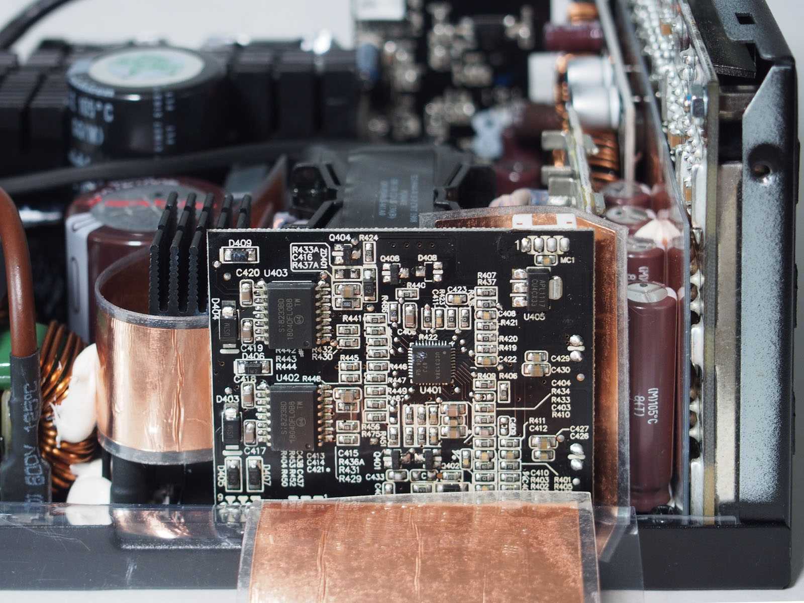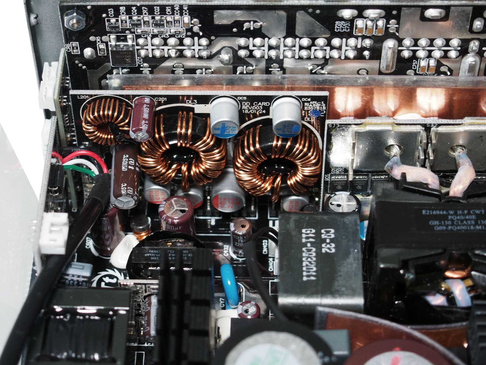 Для мощности в 850 Вт, габариты корпуса блока питания относительно невелики — глубина «всего» 180 мм, поэтому внутренняя компоновка очень плотная. Многие элементы вынесены на отдельные вертикальные платы. В выходных цепях отсутствуют проводные соединения, чтобы исключить их влияние на обдув силовых элементов. Из-за использования микроконтроллеров в цепях APFC и ШИМ-управления, для минимизации наводок, а также в роли термоэкранов от близко расположенных силовых цепей применено большое количество ламинированных фольгированных экранирующих вставок. Крепление многих компонентов усилено герметиком белого цвета. Пайка аккуратная.