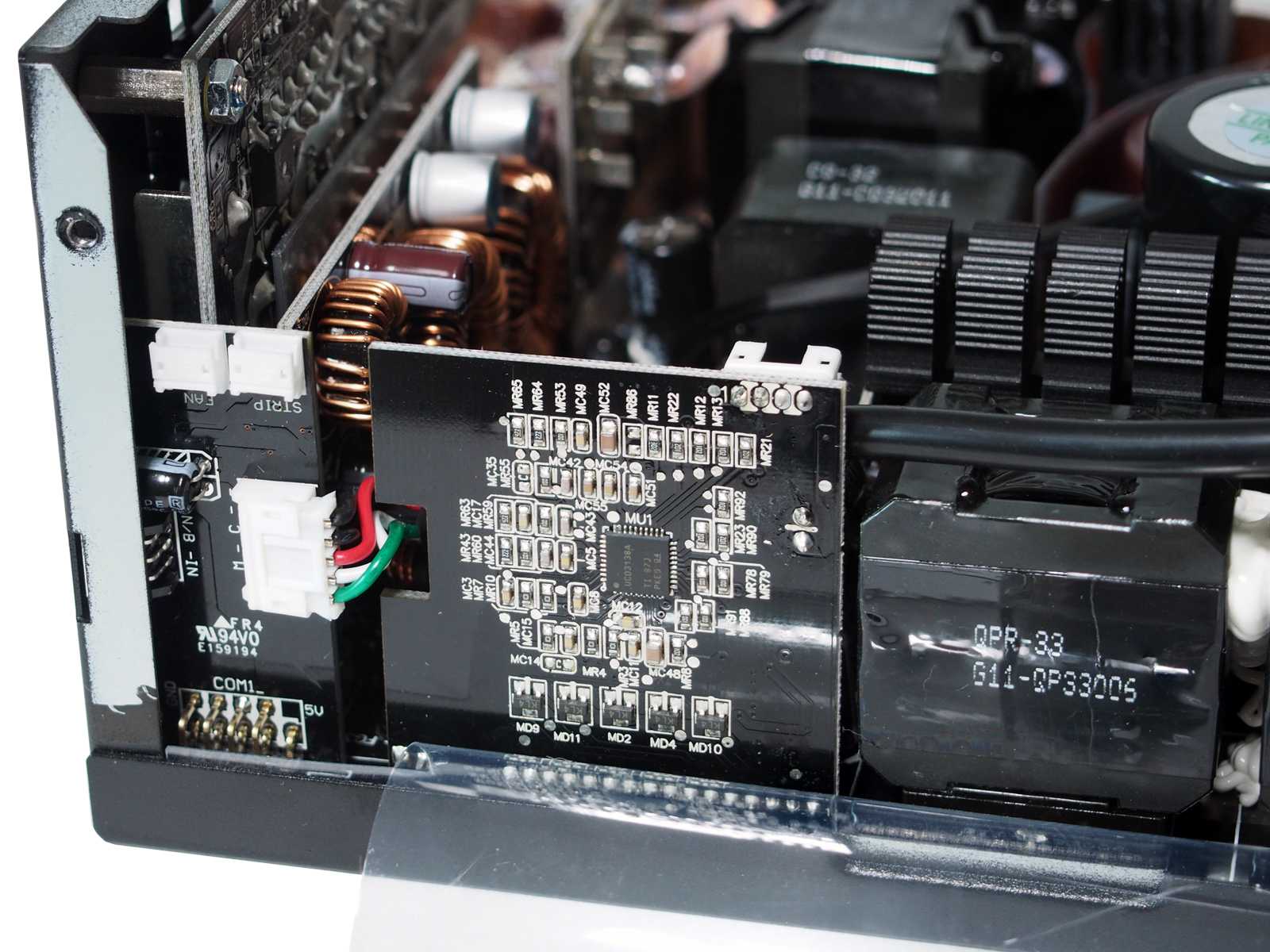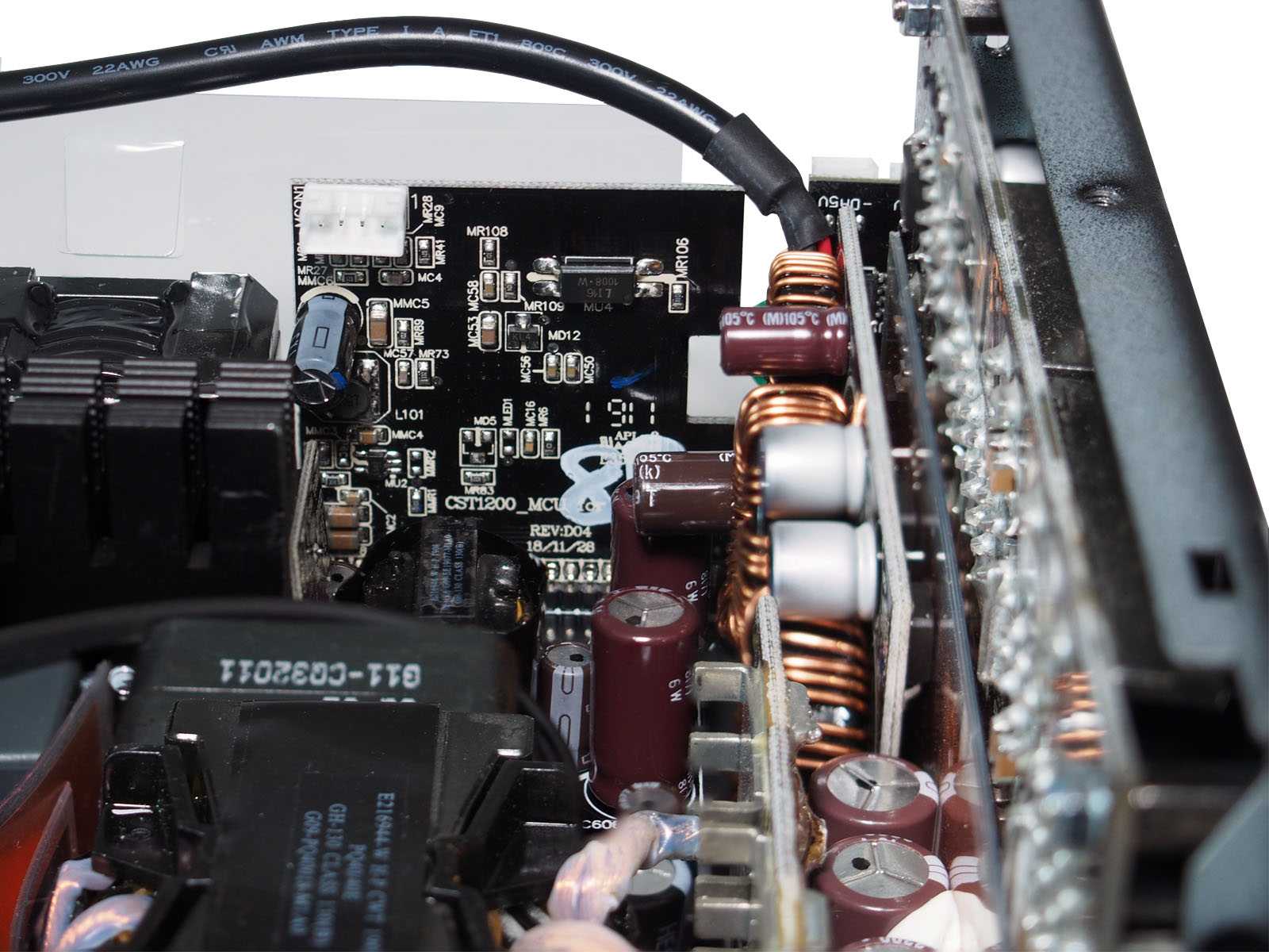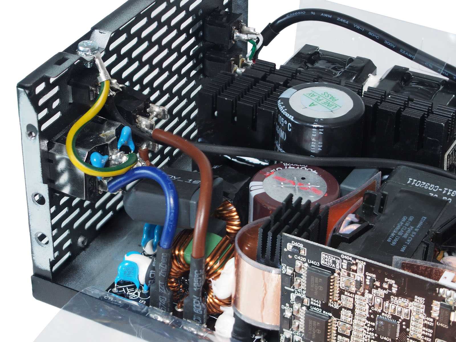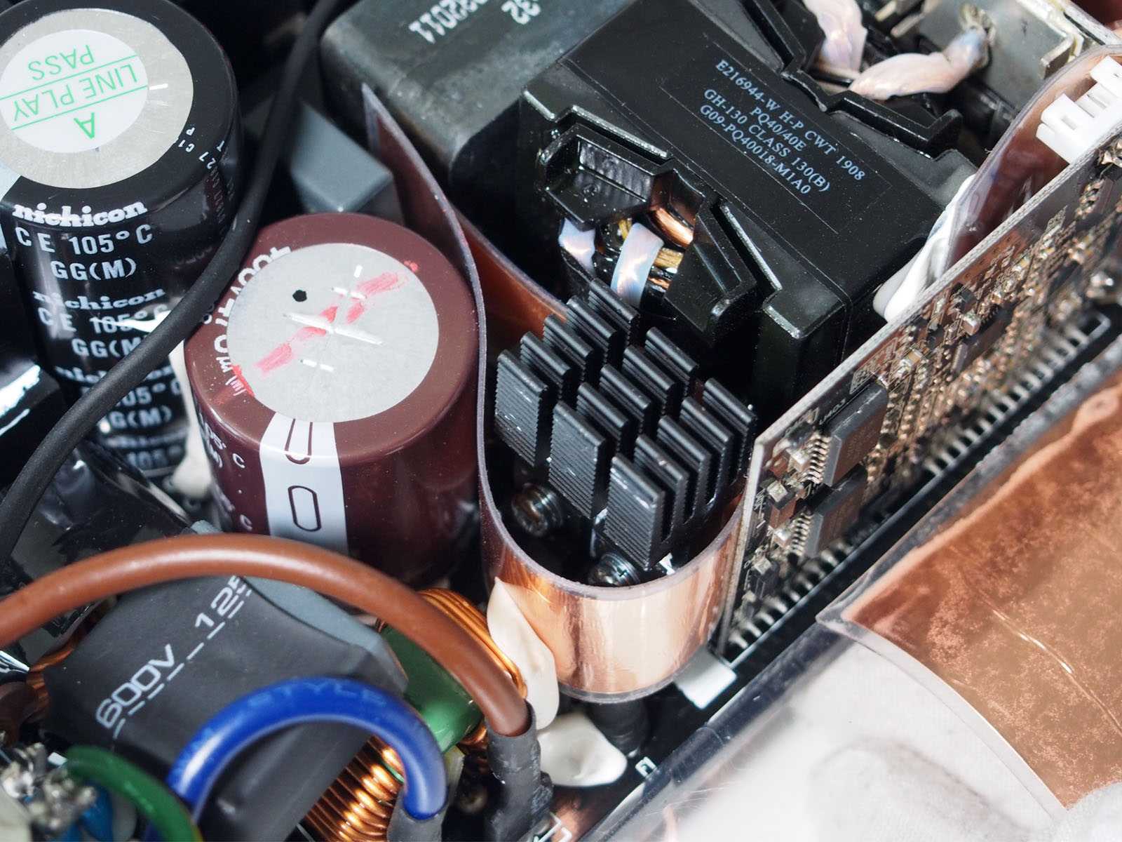 Для мощности в 850 Вт, габариты корпуса блока питания относительно невелики — глубина «всего» 180 мм, поэтому внутренняя компоновка очень плотная. Многие элементы вынесены на отдельные вертикальные платы. В выходных цепях отсутствуют проводные соединения, чтобы исключить их влияние на обдув силовых элементов. Из-за использования микроконтроллеров в цепях APFC и ШИМ-управления, для минимизации наводок, а также в роли термоэкранов от близко расположенных силовых цепей применено большое количество ламинированных фольгированных экранирующих вставок. Крепление многих компонентов усилено герметиком белого цвета. Пайка аккуратная.