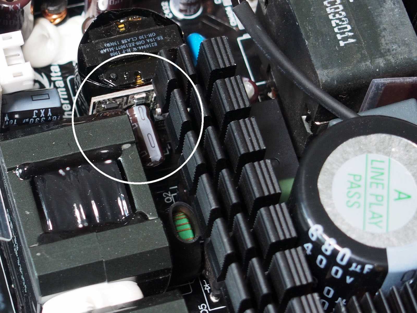Компоненты LLC-преобразователя вынесены на противоположную сторону основной платы. Один компактный радиатор с увеличенным сверху оребрением охлаждает четыре коммутатора Alpha & Omega TF29S50. Их дополнительно экранировали вокруг.