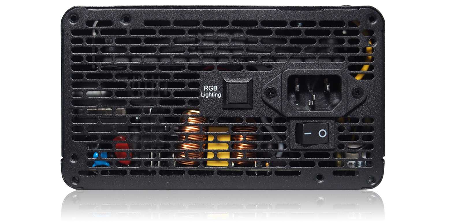 Задняя стенка также обильно перфорирована для минимального сопротивления выходному воздушному потоку. Здесь же гнездо подключения сетевого кабеля питания, тумблер включения и выключения, а также кнопка RGB Lighting для смены режима подсветки. Отверстия для крепления блока питания в корпусе ПК заготовлены с расчетом на два варианта: вентилятором вверх и вниз.
