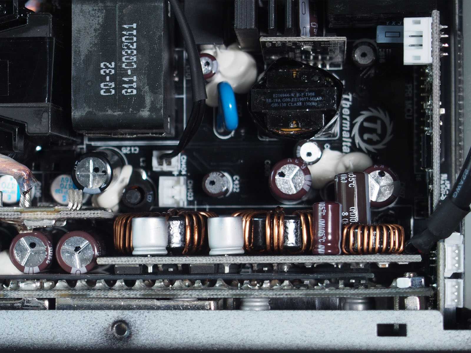 Сразу за ними — небольшой трансформатор и плата «1200 5VSB CARD» источника дежурного питания. В цепи +5VSB используется ключевой транзистор ISD04N65A и управляющая микросхема 0B5282CP. В высоковольтной части параллельно друг другу установлены два крупных «японских» электролитических конденсатора: Nichicon 680 мкФ 400 В и Nippon Chemi-Con 470 мкФ 400 В. Оба с рабочей температурой до 105 °C. Хорошо, что на этом Thermaltake по-прежнему не экономит.
