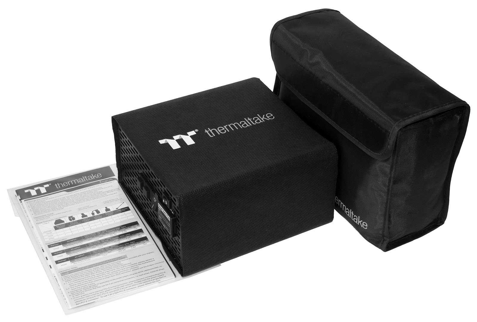 Внутреннее пространство коробки формально разделено на две части: в левой находится блок питания в мягкой вспененной защите и тряпичной обёртке с логотипом премиального подразделения Tt, в правой — черная нейлоновая сумочка с комплектными проводами, также брендированная.