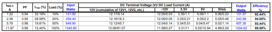 - активный PFC, обеспечивающий коэффициент мощности (PF) более 90%, отдельные DC/DC-преобразователи по линиям 3,3 и 5 вольт, высокоэффективный синхронный выпрямитель c 8- мосфетами по линии 12 вольт;