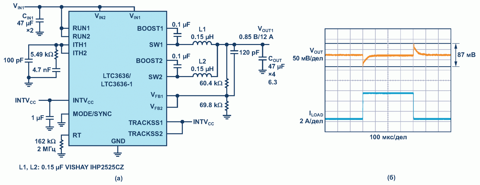 | Рисунок 5. | Схема регулятора 12 А/0.85 В на основе микросхемы LTC3636 (а) и реакция схемы на изменение нагрузки (б). |