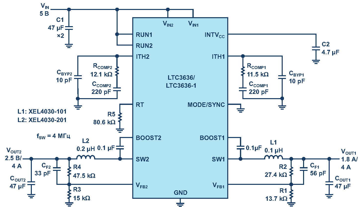Сдвоенный высокоэффективный монолитный понижающий регулятор LTC3636 с выходными токами 6 А на канал способен работать при входных напряжениях до 20 В. Программируемая частота переключения может достигать 4 МГц. Высокая частота переключения существенно снижает размеры дросселя и конденсатора, но, в отличие от многих высокочастотных решений, LTC3636 при этом сохраняет высокие значения КПД. С микросхемой могут использоваться некоторые миниатюрные ферритовые дроссели с меньшими потерями на переменном и постоянном токе. Два канала тактируются противофазно с чередованием импульсов переключения, что подавляет пульсации и, в свою очередь, позволяет уменьшить емкость входного конденсатора.