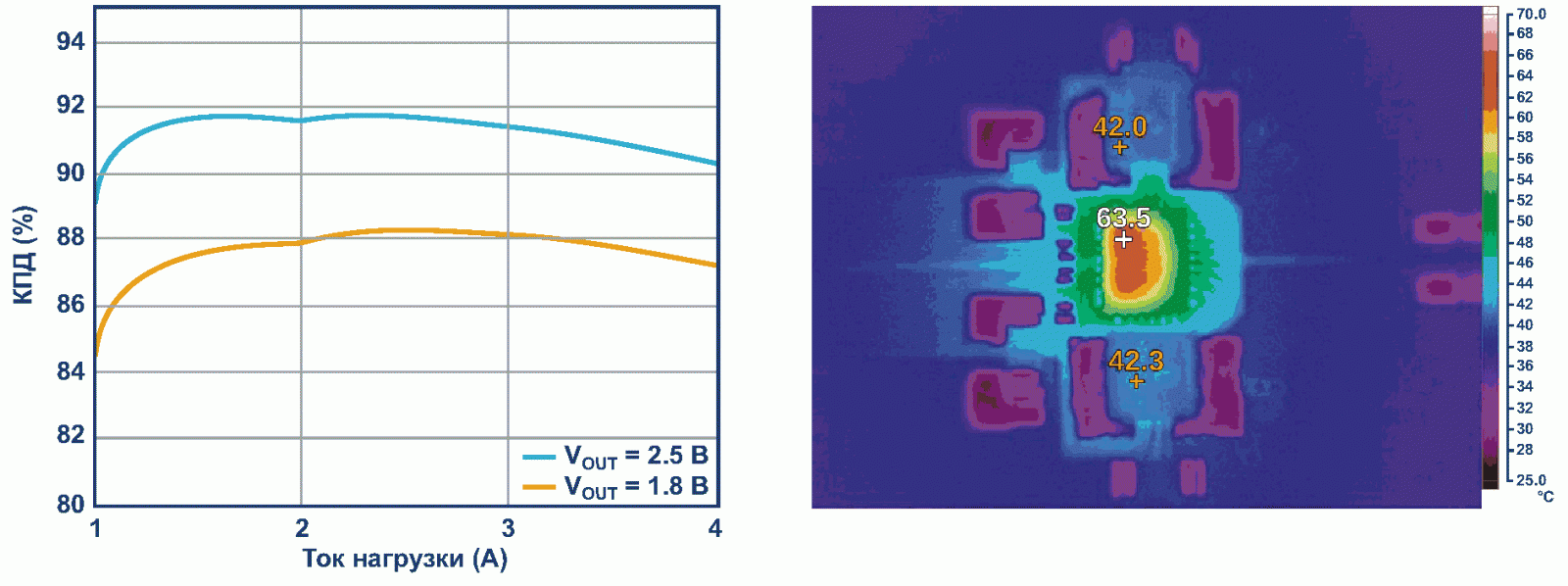 Сдвоенный понижающий преобразователь на Рисунке 1 работает на частоте 4 МГц с очень маленькими дросселями и конденсаторами. КПД и тепловые характеристики микросхемы иллюстрируются Рисунком 2. Термограмма показывает, что температура перегрева преобразователя входного напряжения 5 В при комнатной температуре и естественной конвекции составляет менее 40 °C.