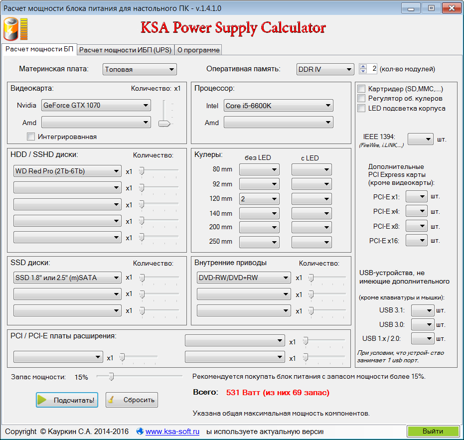 Для более удобного расчета мощности блока питания существует прекрасная программа «Power Supply Calculator». Она также позволяет рассчитать необходимую мощность источника бесперебойного питания (ИБП или UPS).