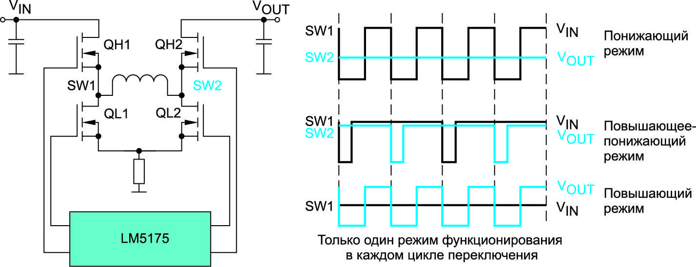Когда входное напряжение выше заданного уровня выходного напряжения, рассматриваемый преобразователь работает в режиме понижения напряжения с выходным каскадом в проходном режиме. Когда входное напряжение ниже заданного уровня выходного напряжения, он работает в режиме повышения, в этом случае его входной каскад находится в режиме прямой проводимости. Когда же напряжение VIN находится близко к выходному VOUT, то для поддержания плавной или, как ее называют, бесшовной работы он чередует циклы повышения и понижения. Поскольку в режиме повышения или понижения напряжения используется только одно плечо в цикле, это позволяет избежать высоких потерь, характерных для чистого двухступенчатого преобразования.