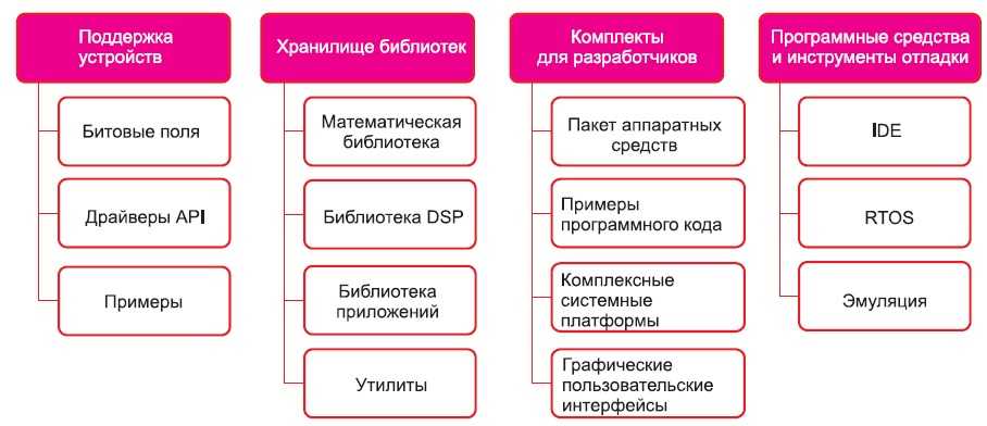 Бесплатное программное обеспечение для работы с аппаратными средствами микроконтроллеров реального времени C2000 controlSUITE представляет собой комплексный набор элементов программной инфраструктуры и программных средств, которые значительно сокращают время разработки программного обеспечения. Пакет controlSUITE включает все необходимые инструменты, начиная с библиотек драйверов для различных устройств и вспомогательных программных модулей и заканчивая полноценными типовыми примерами для сложных системных приложений, которые могут использоваться на всех этапах разработки и оценки программного обеспечения. В нем содержится большое количество документации, библиотек функций, примеров использования и готовых решений для микроконтроллеров на базе ядра C2000, которые постоянно обновляются (рис. 16).