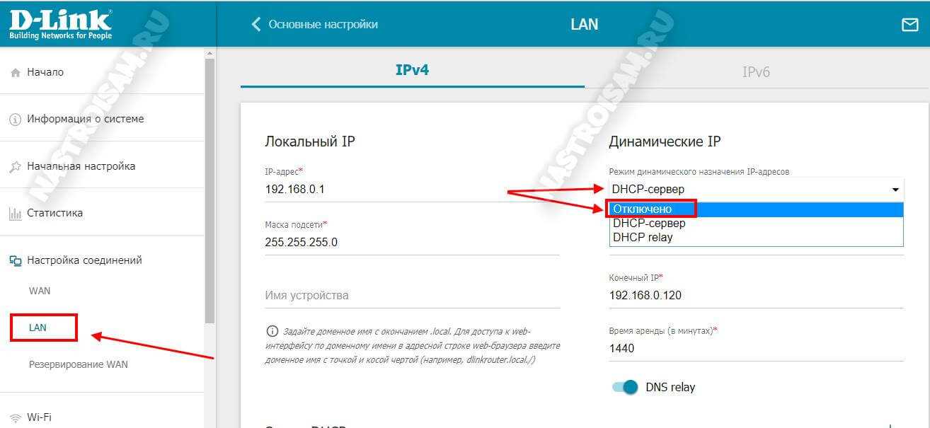 В открывшихся справа параметрах находим подраздел «Динамические IP». Тут должно быть пункт DHCP-сервер. В выпадающем списке выберите пункт Отключено. Нажмите кнопку «Сохранить».