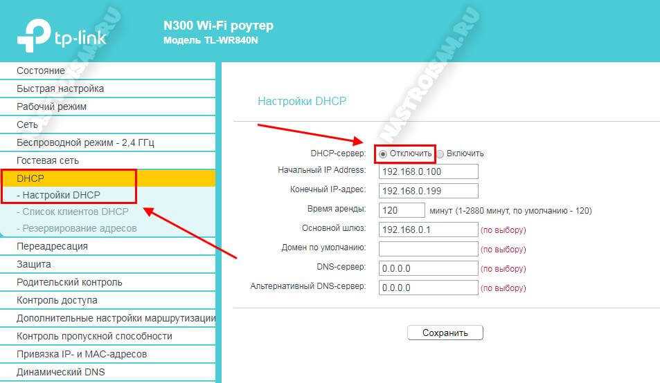 Здесь должна быть строчка DHCP-сервер, напротив которой надо поставить флажок «Выключен». Внизу страницы надо нажать на кнопку «Сохранить», чтобы изменения применялись в конфигурации.
