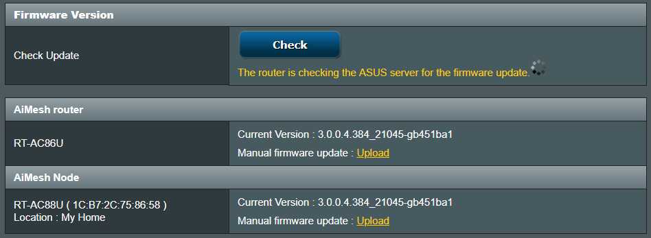 Функция AiMesh программная — «железо» в системах Wi-Fi Mesh и роутерах примерно идентичное, так что для моделей, которые вышли на рынок раньше ASUS предлагает просто обновить прошивку, а новинки будут поддерживать AiMesh прямо из коробки. Скачивать какое-то специальное ПО не нужно — обновится можно прямо из админки, роутер самостоятельно проверит наличие новых версий и проведет обновление.