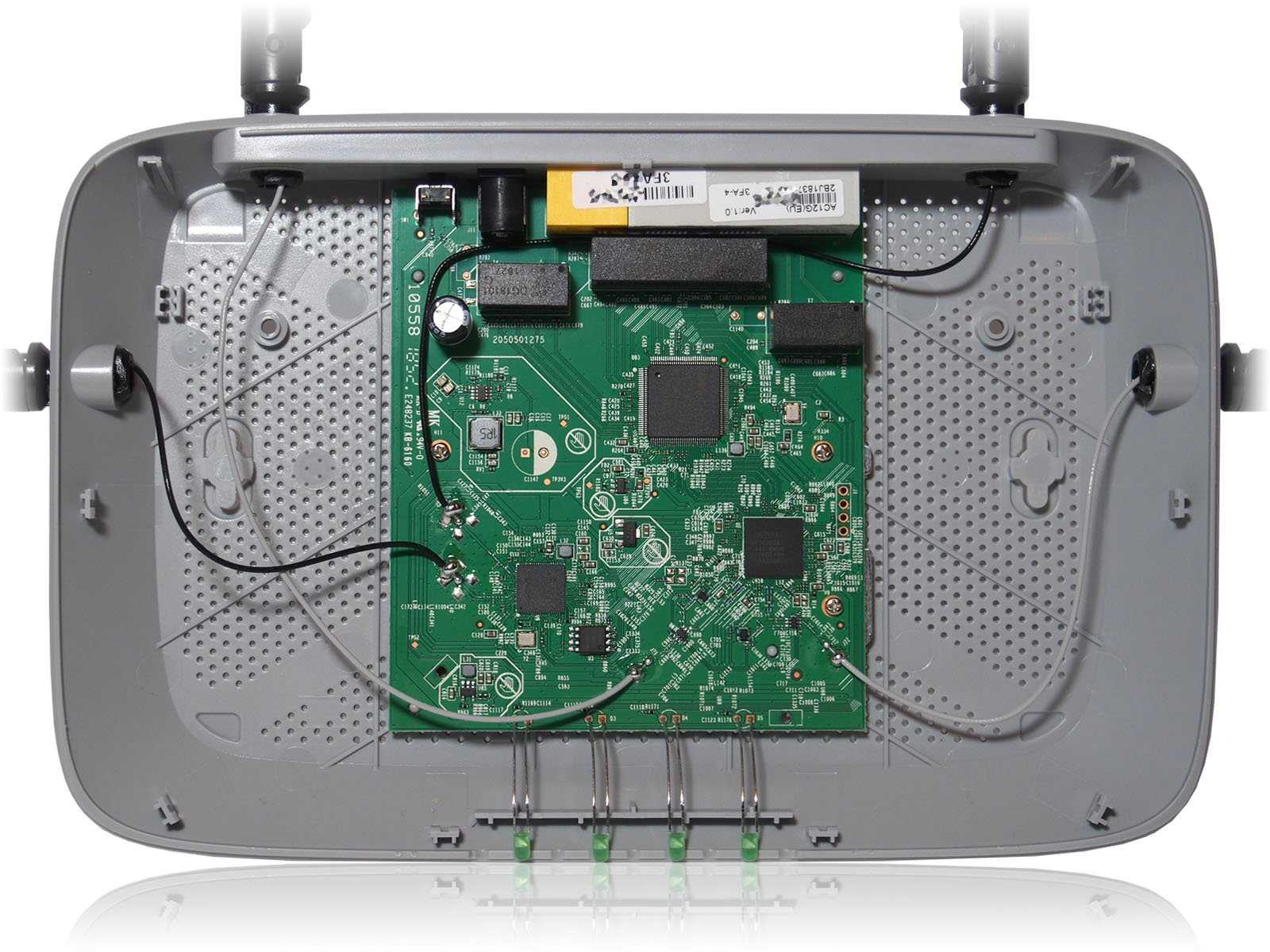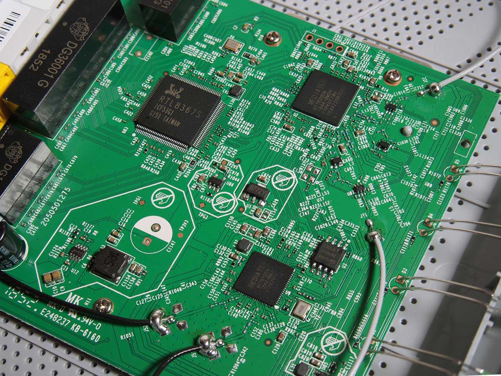 Провода от антенн впаяны в плату напрямую. По дорожкам легко отследить, что две антенны подключены к MT7620DA, а две — к MT7612EN.