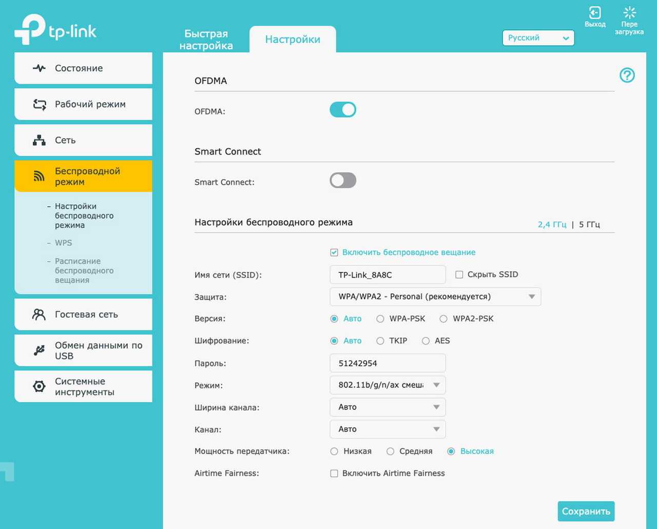 После настройки роутер предельно дружелюбен к пользователю: можно создавать раздельные сетевые беспроводные подключения для каждого диапазона или оставить «единое» с правиом роутера самостоятельно выбирать частоту подключения для каждого устройства.